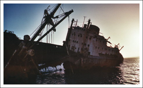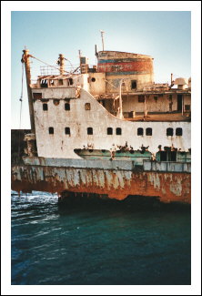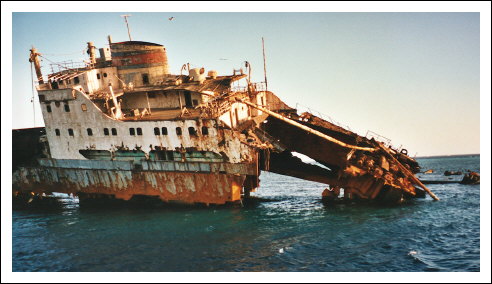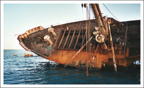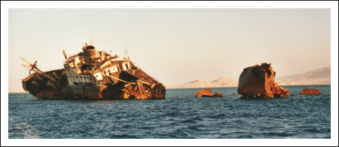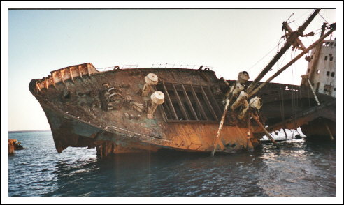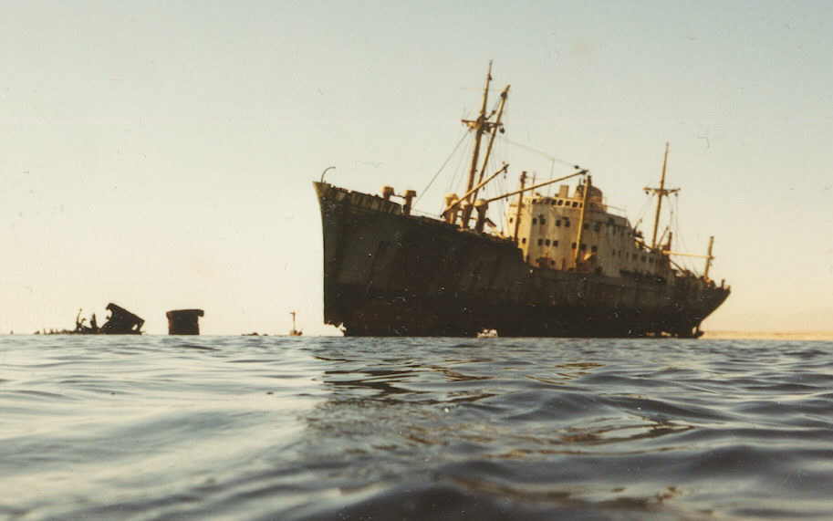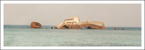 Und tauchen kann man natürlich auch. Entweder es wird ein Tauchgang vom Anker aus bis zu den Fässern und dann zwischen den Korallenstöcken zurück, oder ein Drifttauchgang der wenn alles passt, bis zum Motorblock des Wracks. Zur Erinnerung, so sah es 1995 aus