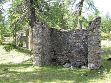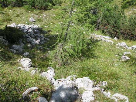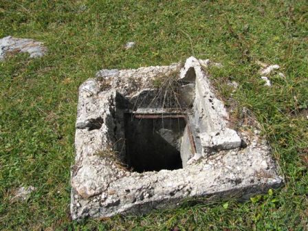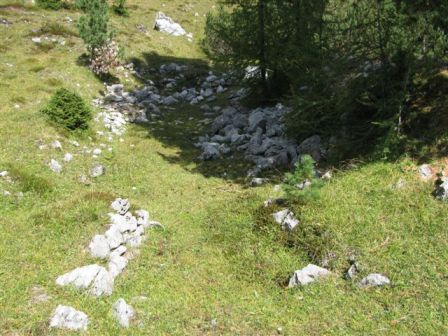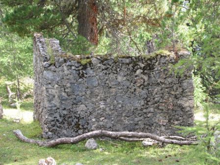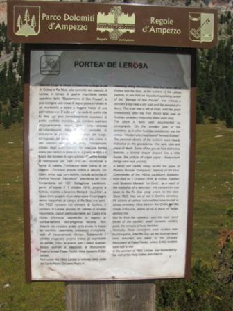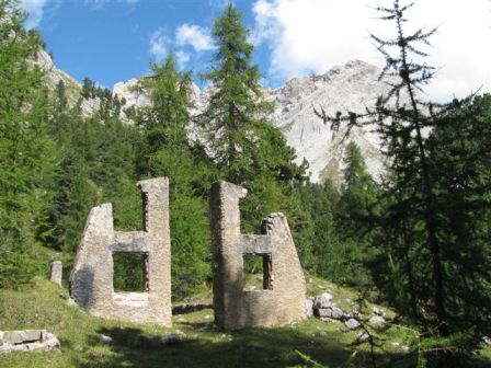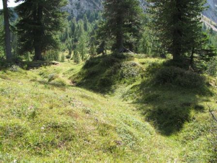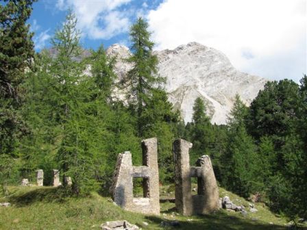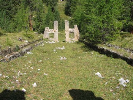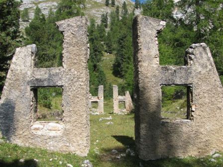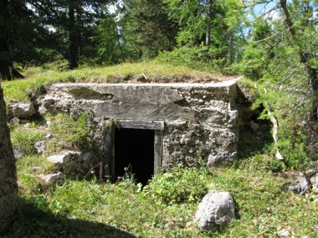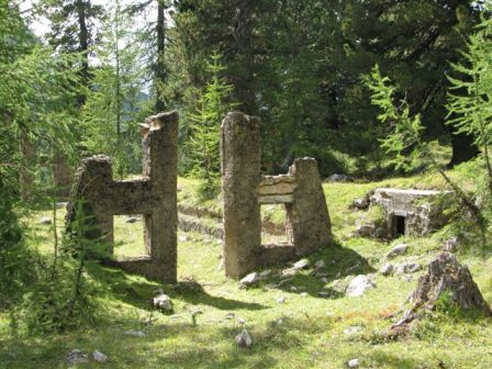 Österreichische Sperre Val Gotres (Gotressperre - Forcella di Lerosa) Anreise: Auf der SS51 Alemagna über Ospitale bis zum Kilometer 111. Kurz danach kommt eine scharfe Spitzkehre, hier rechts abbiegen und ca. 100 Meter durch den Wald nach oben fahren (nur geschottert). Hier großer Parkplatz der schon zum Schloss Hubertus (Ruine) gehört. Die Zufahrt zur Malga Ra Stua ist vollständig geteert und mit PKW problemlos befahrbar, da genügend Ausweichen vorhanden sind. Notfalls mit Hupen bemerkbar machen. An der Malga Ra Stua großzügiger Parkplatz. In der Hauptsaison von Anfang Juli bis Anfang September ist die Strasse für den Normalverkehr gesperrt, es verkehrt ein Buschtaxi. Ab Parkplatz Malga Ra Stua am ehemaligen Kriegerfriedhof vorbei nach rechts abbiegen und den Weg Nr.8 benutzen. Die alte Kriegsstrasse zur Forcella di Lerosa ist sehr steil und nicht zu empfehlen. Weg Nr.8 mündet unterhalb der Passhöhe in die alte Kriegsstrasse ein. An der Passhöhe entsprechend Hinweistafel in englisch und italienisch. Am ehemaligen Kriegerfriedhof Gotressperre vorbei auf einem schmalen Weg durch zusammengefallene und zugewachsene Laufgräben zum Kommandogebäude. Vorsicht vor den dort vorhandenen Schächten und Brunnen. Es ist nichts abgesichert! Sehr schöner Blick auf die Croda de R'Ancona und die dort befindlichen österreichischen Höhenstellungen (Teleaufnahme).