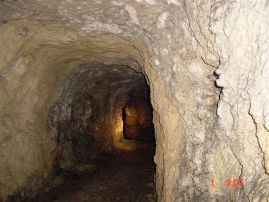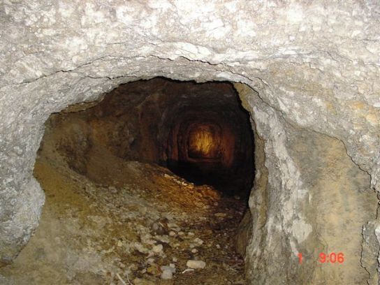 An den Zementsäcken vorbei geht es tiefer in die Batterie hinein und zur 2.Stellung. Eine tiefe Seitenkaverne entpuppt sich an deren Ende als eine Hauptgalerie, die im Zick-Zack in eine lange Galerie weiterläuft. Der Zugang zur 2.Batterie ist entdeckt! |
