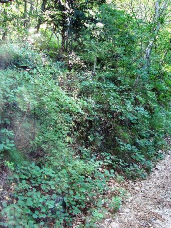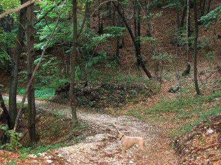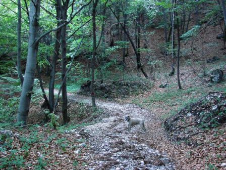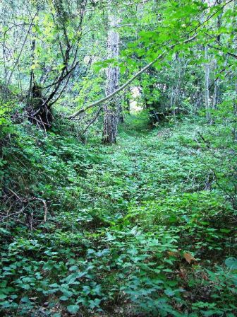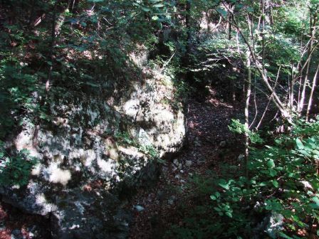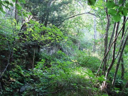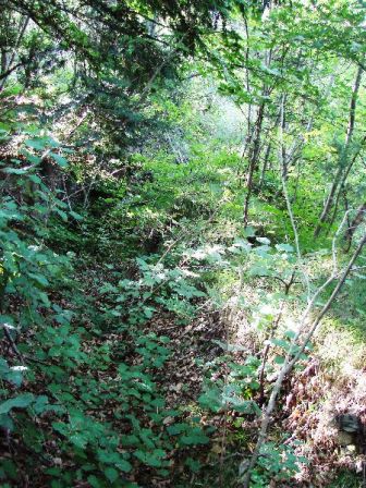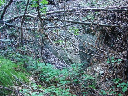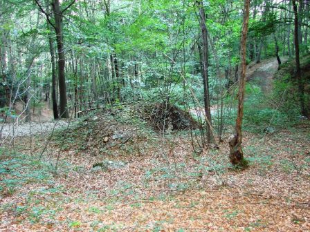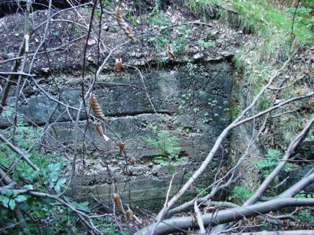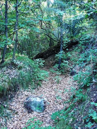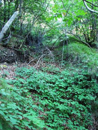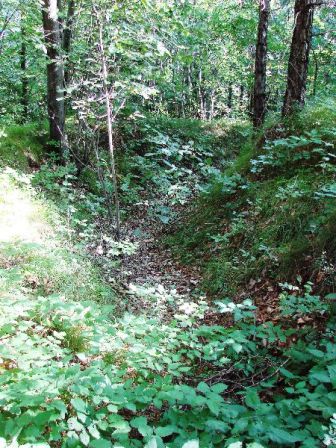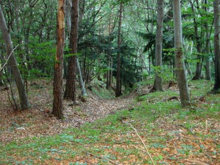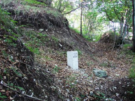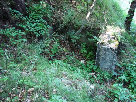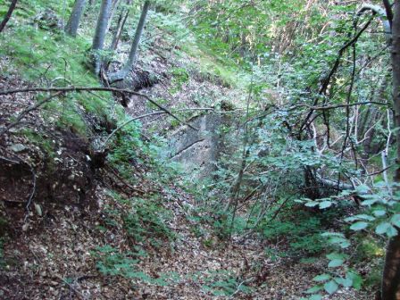 Weitere vermutliche Linie weit vor Mattarello Sie liegt inzwischen weit vor Mattarello, unzweifelhaft: Eine Ex Armierungsstraße führt dahin, es gibt die typischen Straßeneinfassungen aus Trockenmauerwerk,sehr gut gebaut. Kurz vor diesen letzten Stellungen hört sie abrupt auf. Dieser runde Erdhaufen in der Kurve war eine gemauerte Kasematte. Anderes Indiz: Die Straße hört auf bei einem Kalkofen, und die wurden immer angelegt um feldmäßige Befestigungen zu bauen. Die Linie im Wald ist nicht natürlich, sie wurde gegraben. Hört aber nach einigen hundert Metern Länge bei einer ähnlich runden Stellung in einem Dickicht auf. Hier wurde etwas begonnen, aber nicht mehr fertiggestellt.VJ