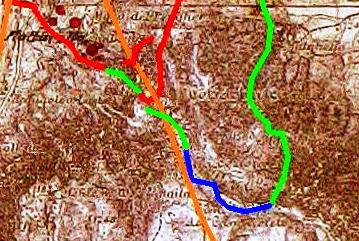 Diese Ausschnitte sind aus der beilage zum Ausrüstungsrapport der Festung Trient vom 1. Oktober 1915. Die Linien wurden von mir zum besseren Verständnis nachgezeichnet. Im roten Kreis der Ort der Feldaufnahme: Rote Linien: fertiggestellt, grüne Linien sind im Bau und blau: geplante Anschlüsse (wurden fertiggestellt). Im roten fertiggestellten Bereich südöstlich des HW Mattarello liegt der Stützpunkt Martini mit PzH-Batterie. Die blaue Linie im unteren Bereich ist die Vervollständigung des Intervalles auf die Vigolana. VJ