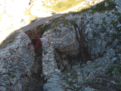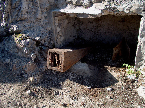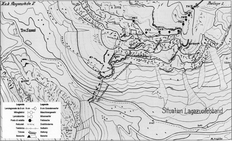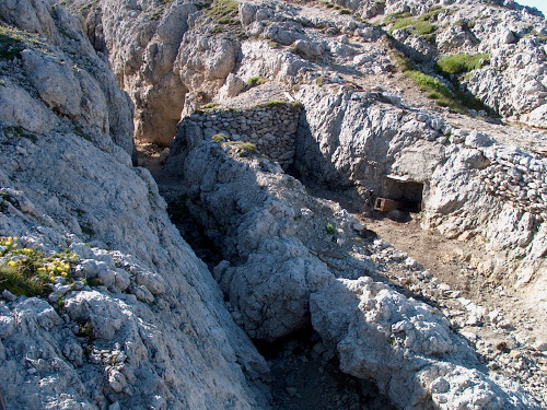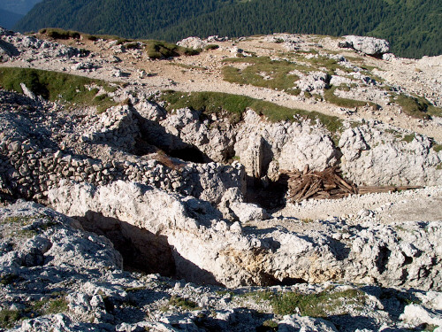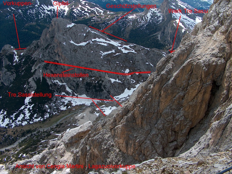 Der Hexenstein – Sass di Stria Der Hexenstein ist ein markanter Berg direkt neben dem Fort Tre Sassi am Valparolapass. Direkt gegenüber ist die Wand des kl. Lagazoui. Rechts vom Hexenstein zog die Front in einem Bogen über den Sett Sass zum Monte Sief und weiter zum Col di Lana. Der Hexenstein war Eckpunkt zwischen Col di Lana und kl.Lagazoui. Der Berg war somit die wichtigste Stellung am Val Parolapass. Ursprünglich sollte das Werk Tre Sassi den Pass sperren, als im Sommer 1915 die Italiener aber 24cm Geschütze einsetzten musste das Werk geräumt werden. Am Hexenstein war zu der Zeitnur eine kl. Feldwache, welche prompt von Alpini angegriffen wurde. Die Alpini konnten sich aber bald wieder vom Berg geworfen werden. In Folge wurde der Berg Kriegsmäßig zur Festung ausgebaut und übernahm die Aufgabe der alten Festung Tre Sassi. Der Hexenstein ist ein klassisches Beispiel für die Verlegung von alten Werken in Kavernenanlagen! Am Fuß des Berges entstand eine Nahkampfgalerie vom Werk Tre Sassi ausgehend in Richtung Passhöhe, von welcher aus der Pass mit Mg´s bestrichen werden konnte. Die Geschütze wurden in den rückwärtigen Hanglagen des Berges aufgestellt. Der Gipfel wurde zur Beobachtungs- und Feuerleitstelle. Der Berg beherrschte den Val Parola und den Falzaregopass und verhinderte aktiv einen Durchbruch der Italiener ins Pustertal, auch die Alpinistellung „Cenga Martini“ in der Lagazouiwand konnte nur von Hexenstein aus mit beschossen werden. Anfahrt: Val Parolapass, siehe Werk Tre Sassi oder kl. Lagazoui. Gleich hinter dem Werk führt der Pfad dem Hangrücken zu den Stellungen empor. Der Berg ist mit der üblichen Vorsicht problemlos zu Besichtigen, nur kurz vor dem Gipfel sind einige schwierige Stellen, welche aber mit Seilen und Leitern gesichert sind. Zum Gipfel sind es nur ca. 50 min bei gemütlicher Gangart. Im Werk Tre Sassi ist ein kleines sehenswertes Museum untergebracht! WP