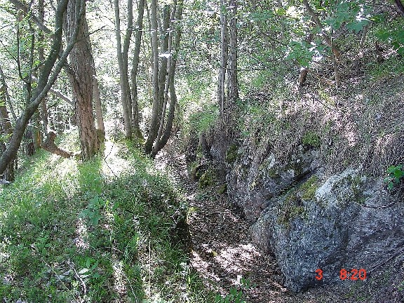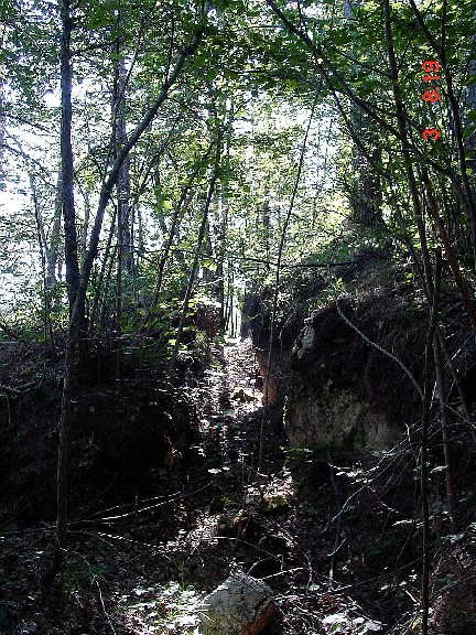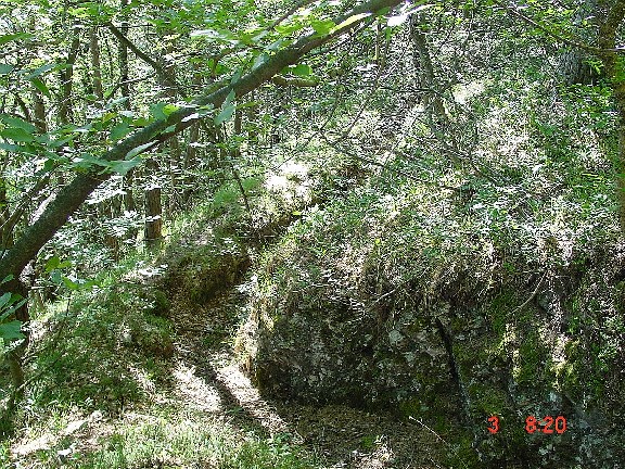 Es handelt sich dabei um einen Stützpunkt mit einem Hauptkampfgraben, dessen Reste sich ca. 400m lang am Nordosthang des Calisio erstreckt. Es ist die 1.Linie des gestaffelten Verteidigungssystems, das sich über den gesamten Bereich der Carbonaia erstreckt und diente unter anderem natürlich zum Schutz des unterirdischen "Werkes" unter dem Gipfel des Monte Calisio. Hinter dieser Linie befinden sich Reste von Fundamenten von Barackenlagern, natürlich Armierungswege , die zu den Kavernen führen und Munitionslager in Kavernen. Verteilt und verstreut über das rückwärtige Gelände, aber immer in der Nähe von Armierungswegen sind einige wenige Geschützstellungen der Feldartillerie. Der Hauptkampfgraben selbst war ausgemauert zur Frontseite hin, unterteilt sich in viele Einzelstellungen, die als Sappen vorgetrieben wurden, Reste von MG- Stellungen und kleinen im Grabenbereich eingebauten Unterständen sind noch erkennbar. Insgesamt gesehen, ist dieser Stützpunkt das typische Beispiel für die infanteristischen Verteidigungsanlagen des Calisio, der Carbonaia bis hin zum Dos Castion/Castel Vedro und den Stellungen oberhalb von Civezzano. Die Hauptverteidigungslinie war durchgängig ausgebaut, verstärkt wurde sie durch die Einfügung dieser Stützpunkte. Artillerie gab es wenig in diesem Bereich, diesen Schutz übernahm direkt das "Werk" Calisio mit seinen Batterien im unmittelbaren Vorfelde des Gipfels. Da habe ich mal wieder den richtigen Riecher gehabt. Da musste etwas sein, das fiel mir beim Vorbeifahren auf, als ich den Zugangsgraben erkannte. Kaum geparkt und in den Wald hinein, traf ich nach nur 10m die erste Kaverne. Auf dem Rückweg in Richtung Campel fand ich dann noch Reste eines weiteren Barackenlagers, das werde ich dann beim nächsten Ausflug fotografieren und wenn mich nicht alles täuscht, sind da in der dazugehörigen kleinen Talmulde weitere Kavernen. Auf dem Calisio wurde wirklich gewühlt, nur habe ich den Eindruck, das diese Anlagen zum Spätstadium der FS Trient gehören. Die Kavernen sind bei weitem nicht so gut ausgebaut, wie auf dem Soprasasso, es gab kaum Betonverkleidungen. Dafür sind die Kavernen tiefer und haben zum überwiegenden Teil mehr Felsüberdeckung, wahrscheinlich war der Innenausbau somit nur in Holzverkleidung mit Teerpappe- Beschichtung. VJ
