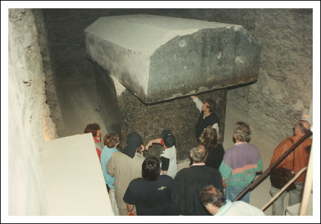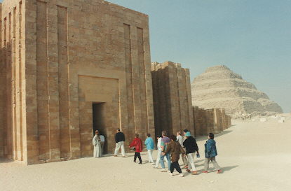 Nach einigen kilometern Busfahrt von Giza, an Kanälen durch das fruchtbare Delta entlang, erreicht man Sakkara, die Begräbnisstätte der antiken Stadt Memphis. Bereits während der 1. Dynastie wurden hier Gräber errichtet. Hier stieß man auch auf Spuren der ersten Pharaonen Ägyptens, unter ihnen der legendäre Narmer. Am bekanntesten ist die Stufenpyramide des Djoser (3. Dynastie). Es ist der erste große Steinbau Ägyptens und die älteste Pyramide überhaupt. Der Plan und der Bau wird dem genialen Architekten und Universalgenie Imhotep zugeschrieben. Imhotep wurde später als Gott verehrt. Sein Grab wurde bis heute noch nicht aufgefunden, man vermutet es jedoch ebenfalls in der näheren Umgebung von Sakkara. Imhotep wich zum ersten Mal von der bis dahin in Ägypten gebräuchlichen Grabform der Mastaba, einer niedrigen Lehmziegelkonstruktion ab. Er entschied sich für die klassische Pyramidenform. Die Untersuchungen des Bauwerks hat sechs Bauplanveränderungen ergeben. Zunächst wohl nur vierstufig geplant, wurde die Pyramide schließlich sechs Stufen und eine Höhe von 61 Metern erweitert. Sehr deutlich sind die verschiedenen Schichten aus Balken, Ziegeln und Steinquadern zu erkennen. Die Stufenpyramide von einen Tempelbezirk umgeben, der seit mehreren Jahrzehnten rekonstruiert wird. Die Architektur bildet in Stein die realen Gegenstände nach (Schilfbündel und ähnliches). Innerhalb dieses Bezirkes befand sich der Totentempel des Djoser. Bemerkenswert ist hier der sogenannte Serdab. In diesen Raum kann man durch zwei Löcher in Augenhöhe auf eine Statue des Königs blicken, die heute natürlich nur noch eine Kopie ist. Ursprünglich sollte der verstorbene König in Gestalt der Statue aus diesen Raum hinausblicken. Weiter findet man im Tempelbezirk mehrere Anlagen, die dem Sed-Fest dienten. Das Sed-Fest wurde nach 30 Jahren Regierungszeit durchgeführt und diente der rituellen Erneuerung des Herrschers.