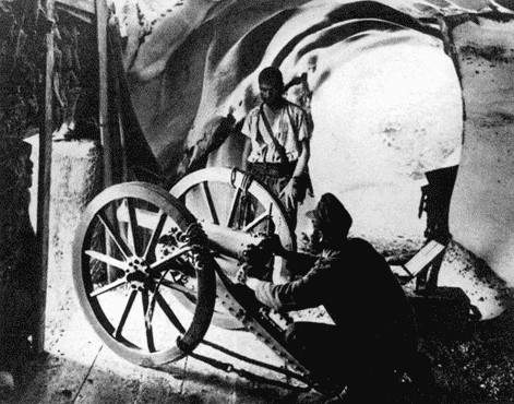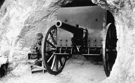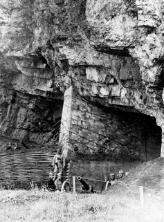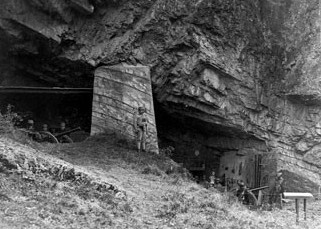 Foto zeigt das kleine Geschütz in einer Kavernenstellung. Daten