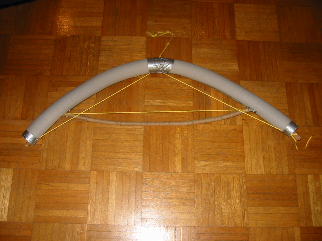 So schnitt ich einen Ast von einem Strauch, bog ihn durch Schnüre in die gewünschte Form. Sollte sich später zeigen, dass sich der Ast zu stark durchbiegt, wir er durch einen Quer-Aast stabilisiert.