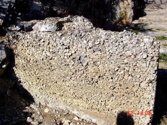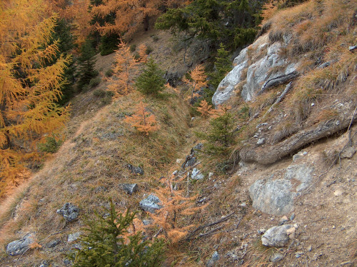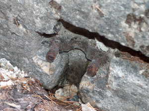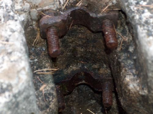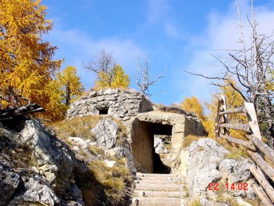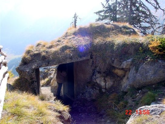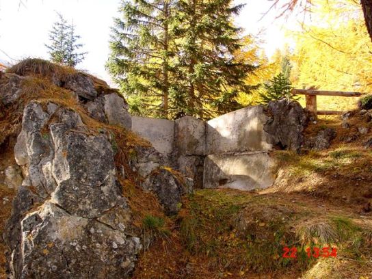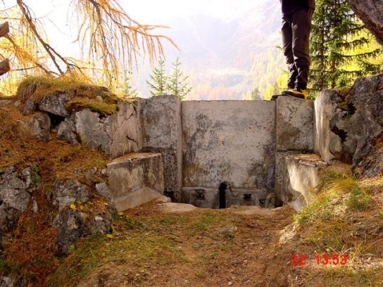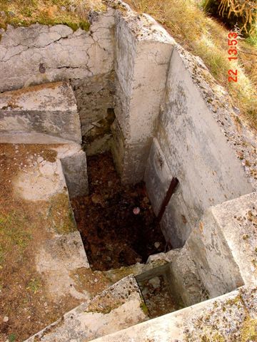 Diese Stellung bezeichnet man als Scheinwerfereck. Möglich, das hier 2 Scheinwerfer standen. Die Betoneinfassung ist sehr schwach, die oben liegende Kasematte ebenfalls. War eventuell nur ein Postenstand? Die Trennmauer verdeutlicht die ganze Armseligkeit des ausgeführten Betons, hier wird geschreddertes Gestein durch die Zementmilch lediglich zusammengehalten. Bei den Stellungen gibt es Scharnier- und Auflagerreste von Klappen, die den unteren "Kellerteil" abdeckten. Die seitlichen Nischen waren evt. für die Mischapparaturen (Azetylenscheinwerfer). Beide Stellungen sind exakt gleich ausgeführt. Als MG-Stände habe ich meine Zweifel. So offen waren die eigentlich nie, außerdem keine Spuren von Befestigungen von Lafetten, zum Beispiel der altartigen Festungslafetten, die man in Gomagoi ausbauen konnte. Der freundliche Bergbauer bestätigte im übrigen den Einbau von 2 Reflektoren. VJ