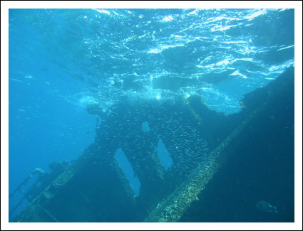 Viele kleine Fische halten sich im Strömungsschatten der Aufbauten auf.