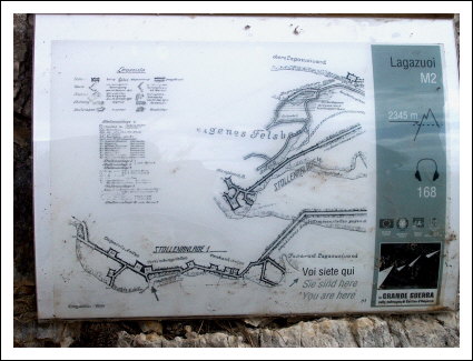 Tafel mit den Plänen der Lagazoi Stollen, unten der