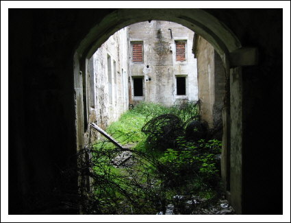 Blick durch das jetzt verrammelte Zugangstor in den Innenhof.