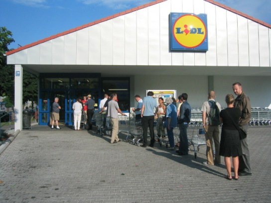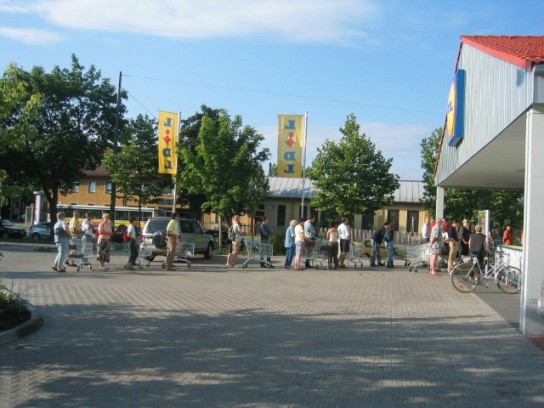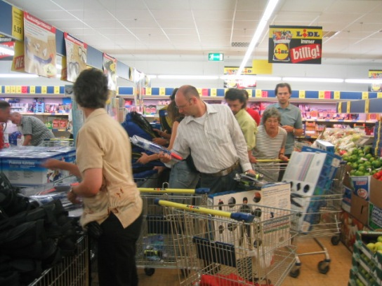 wir sind die Ersten, unser Einkaufswagen schon in der Pole-Position.