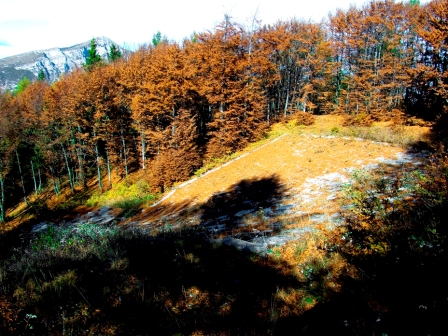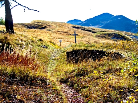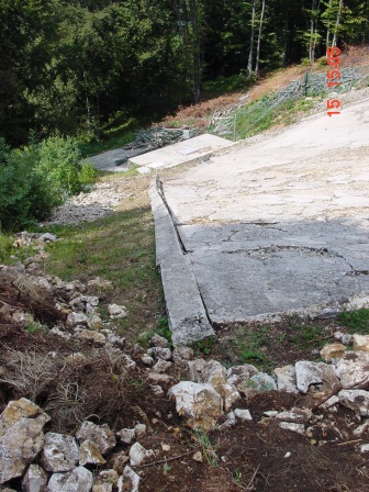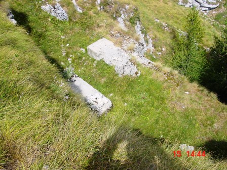 Die wichtige Telefonzentrale, die Artilleriebeobachter schliefen in ihrer Stellung, die hatten dort eine Betonbaracke mit Wellblechdach drin, die Zentrlae war uneinsehbar aus der Feindrichtung, oben auf dem Betonfundament stand die Baracke, dadrunter war eine Art Kavernenkeller, die beiden Betonblöcke: der Erste war das Fundament der Telefon- und Strommasten, der Zweite entweder für einen Generator oder eine Schalttafel, liegen noch Reste von Porzellanisolatoren herum. Die Zentrale war so wichtig wie der B- Stand, von hier wurden alle Zielkoordinaten an die Batterien übertragen. Wunderbare Stellung jedenfalls. VJ Importante era anche il centralino, l´osservatori dormivano dentro l´osservatorio, avevano una baracca con muro in cemeno e tetto in lamiera ondulata dentro la loro postazione. Vicino all´ingresso molto bene nascosto e fuori vista dal nemico era il centralino, una baracca con fondamenta in cemento, sotto era anche una piccola caverna. Ci sono due blocchi di cemento, il primo serviva per far uscire i pali del corrente e delle linee telefoniche, sembra che avevano anche un generatore sul secondo blocco di cemento oppure il quadretto principale della distribuzione, ci sono resti di isolatori comunque in giro. Il centralino era importante come l´osservatorio, distribuiva le coordinate a tutte le batterie e comandi. Bella postazione comunque. VJ
