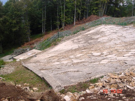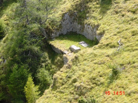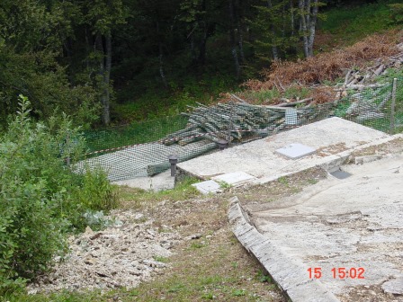 Die Zistenanlage ist gebaut wie beim Werk Tombio, Filerkammer mit Aktivkohle und grosser zementierter Auffangfläche. Sie funktioniet einwandfrei und versorgt die Baita SAT mit Trinkwasserqualität. Von dort aus führt auch eine neue Wasserleitung zur neuen Zisterne der Provinz, deren Inhalt ( ca. 2500m³) zur Brandbekämpfung dient. Die Kuk baute für die Ewigkeit, die Auffangfläche wird jetzt mit neuem Zement repariert. VJ Fatto come al forte Tombio, grande invaso in cemento, camera di decantazione e seconda camera per la raccolta dell´acqua. Funzionante e usato ancora dalla baita SAT. Inoltre la Provincia la usa e porta l´acqua in una nuova cisterna sulla cima del Biaena per scopo antincendio.Sembra che gli austriaci costruivano per l´eternita`, solo l´invaso adesso vogliono riparare con cemento nuovo. VJ