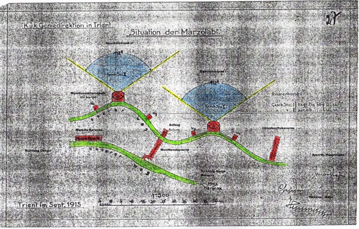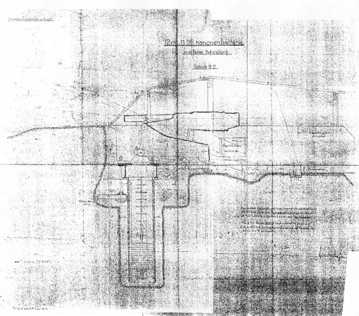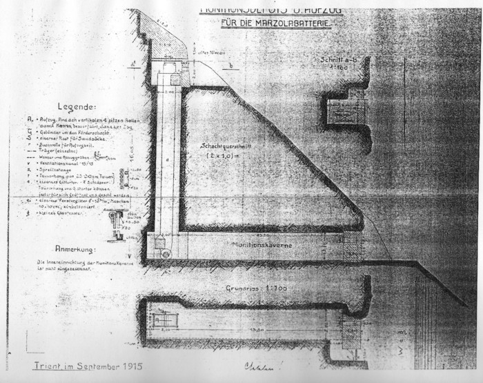 Die Zeichnungen zeigen die montierte 12cm/M96 Kanone auf Festungslafette (MSK) mit Schrapnellschirm und max. Höhenwinkel von 26 Grad, so wie sie in der Batterie Marzola montiert war und die weiter unterhalb liegende Munitionskaverne mit dem Aufzugsschacht für die Munition. Zur Geschützstellung: Deutlich zu sehen, innerhalb des betonierten Drehkranzes (gebogene Stahl-Laufschiene, jetzt natürlich entfernt) ist der verschüttete Schacht für die Gegengewichte die als inertiale Rücklaufbremse dienten. Mehr als 26 Grad Höheneinstellung wurde vom Artilleriekommando nicht gefordert, der Seitenrichtwinkel ist 112 Grad. Die Geschütze hatten eine ausreichende Reichweite, das Valsugana als auch das Valsorda zu bestreichen. Aufgrund der Montage auf Festungslafette war ihr Feuer auch sehr präzise. VJ