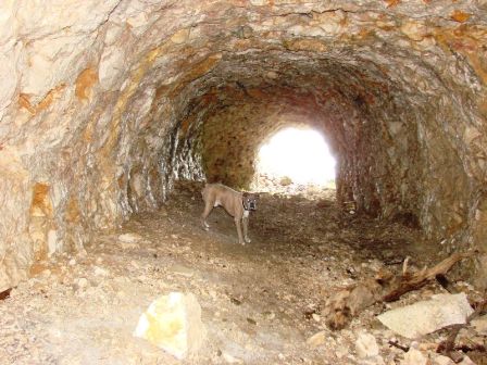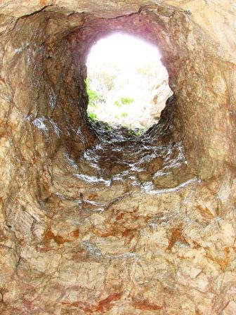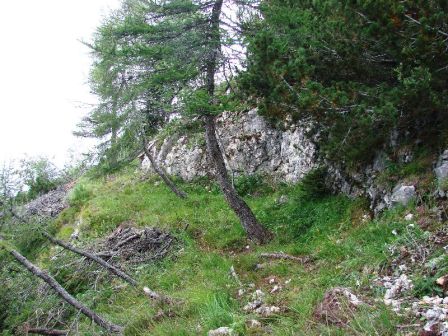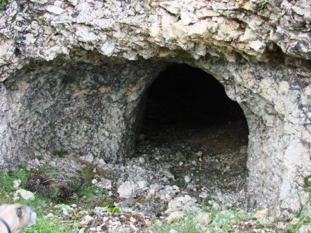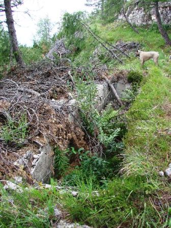 Das Munitionslager mit dem Aufzugsschacht. Der Eingangsbereich wurde "primitiver" gebaut, nicht so schön wie lt. Zeichnung des Hptm. Amorth. Vom Mun. Lager führt der Weg vorbei an der leider defekten großen Zisterne zu einem Wendeplatz. Gleich dahinter liegen die Reste der großen 2-teiligen Baracke (Küche und Magazin).VJ