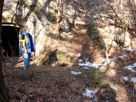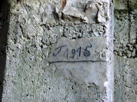 Die Kavernen hinter der Stellung mit dem Datum 1915. Im Bild auch Alberto vor dem Eingang der großen Kaverne. Schön zu sehen im Eingangsbereich der 1.Kaverne der Ofen/Küchenherd. Die Kavernen waren untereinander verbunden, man scheute keinen Aufwand, wie üblich in der Festung Trient. Le caverne della posizione con la data di costruzione 1915. D´avanti all´ingresso della caverna piu grande c´e´Alberto. In una caverna esiste ancora la stuffa/cucina.Le caverne erano collegate fra di loro con una galleria. Si lavorava bene nella fortezza di Trento anche se costava tanto denaro.
