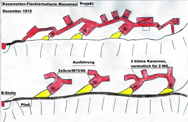 So der offizielle Name auf der Projektskizze, die ich bei meinen Recherchen im KA fand. Hierbei handelt es sich um eine 2-geschützige Kavernenbatterie und einer MG-Kaverne, untereinander mit einer Galerie verbunden und mit manchen Stichkavernen, die als Lager und Unterkunft dienten, sogar eine Küche ist eingezeichnet. Ein relativ aufwendiges Projekt mit dem Datum Dezember 1915. In der Armierungsliste der FS Trient ( Anlage zu Res. Nr.5876A- Übersicht der Batterien der Sicherungsarmierung und nicht armierten Emplacements) wird die Batterie angegeben mit dem taktischen Zeichen 1/V als Kavernenbatterie Massenza, bewaffnet mit 2x9cm/M75/96 Geschützen. Sie gehört damit zur Verteidigungssektion V der Festung. Eine einmalige Chance zu überprüfen, ob und wie das Projekt ausgeführt wurde. Für mich eigentlich die 2.Chance. Damals bei der Überprüfung des Projektes der Kampfanlage am Col della Caura auf ca. 1500m Höhe scheiterte ich, da unterhalb des Einganges zur Batterie der Berghang abgerutscht war. Lediglich eine 2-geschützige Kavernenbatterie war erkennbar. Die Projektzeichnung stellte aber eine wesentliche größere Anlage mit zusätzlichen MG-Kavernen und Scheinwerferständen dar. Diesmal hatte ich mehr Glück. Die Anlage Massenza fand ich, dank den Hinweisen der ortsansässigen Bevölkerung, die diese Kavernen während WKII als Luftschutzbunker benutzten. Die amerikanischen B-22 Bomber und andere Jagdbomber flogen durch das Val dei Laghi um über den Soprasasso (807m hoch) fliegend danach im Etschtal die unmittelbar unterhalb des Soprasasso befindliche Eisenbahnbrücke der Brennerstrecke zu bombardieren. Das ging aber leider schief, von 32 angreifenden Maschinen wurden 32 beim ersten Angriff abgeschossen. In den ehemaligen KuK - Kavernenanlagen standen die Vierlinge 2cm und 3,7 cm Sk dicht an dicht. Da hatte die US-Airforce absolut keine Chance und es war daher das reinste Massaker. Daraufhin wurden keine Tiefflugangriffe mehr durchgeführt. (PS: Die Brücke wurde durch einen Zufallstreffer zerstört, die US-Bomber flogen in sehr großer Höhe und versuchten mit Bombenteppichen die Brücke zu zerstören, dabei wurde der gesamte westliche Teil von Trient zerstört. Der Erfolg war relativ, die Umgehungsstrecke der Eisenbahn war bereits fertig gebaut. So mancher Bomber wurde durch die auf dem Monte Bondone (2200m hoch) stehende schwere Flak (88mm) heruntergeholt.) Zurück zur Kavernenbatterie Massenza: Vorab: das Projekt wurde so nicht ausgeführt. Es gibt 2 Geschützkavernen, die untereinander nicht verbunden sind und eine zusätzliche Anlage (untereinander verbunden) mit kleineren Kavernen, vermutlich MG-Stellungen, und eine B-Stelle auf einer vorspringenden Felsnase. Die Anlage als Flankenbatterie ist extrem gut getarnt, ich bin 2-mal daran vorbei gelaufen bevor ich die schräg auslaufenden Geschützstellungen im steilen Felshang gefunden habe. Der Ort ist strategisch gesehen sehr gut gewählt, das gesamte Val dei Laghi (hier relativ eng) konnte perfekt bestrichen werden. Die gesamten Anlagen selbst waren bombensicher, wie im Projekt bereits vermerkt, ist die Felsüberdeckung 140m. Die schräg stehenden Schussöffnungen der Batterie sind von der Feindseite her sehr schwer erkennbar und bieten allerkleinste Ziele. Von der Ausführung her entspricht sie damit perfekt dem allgemeinen Befehl des GM Steinhart zum Ausbau der FS Trient. Endlich konnte einmal Projekt und Bauausführung miteinander verglichen werden. Gruß VJ