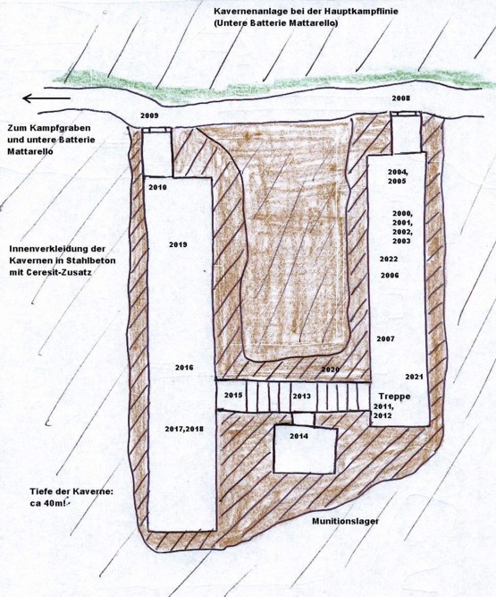 Rückwärtig hinter der Hauptverteidigungslinie südöstlich der unteren Batterie Mattarello liegt in einem kleinem Seitenteil versteckt eine Kavernenanlage, die als Truppenunterkunft mit Munitionsmagazin diente. Es handelt sich dabei um 2 sehr tiefe durch eine Galerie miteinander verbundene Kavernen, die aufgrund einiger technischer Einzelheiten sehr bemerkenswert hinsichtlich der Befestigungstechnik des Jahres 1915 sind: Zum einen sind es die in der Tiefe längsten Kavernen, die im Festungsbereich Trient auffindbar sind. Eine Kaverne ist mehr als 40m tief in den Fels gebohrt. Des Weiteren wurden die Kavernen trotz mehr als ausreichender Felsüberdeckung (ca.10 m) von innen mit einem bis zu 40cm starken Stahlbetonhemd verkleidet, hier konnte wiederum der eindeutige Beweis dokumentiert werden, das die Verwendung von Beton mit Eisenmattengeflecht, also der heutige übliche Stahlbeton, vom Genie von Trient bereits 1915 standardmäßig angewandt wurde. Zudem wurde hier eindeutig die feinkörnige Betonmischung lediglich durch den Zusatz von Ceresit wasserdicht hergestellt und verarbeitet. Es gibt keine äußere Zinkblechverkleidung, obwohl in diesem Felsgestein viele Wasseradern verlaufen, man also sogar mit drückendem Wasser rechnen musste. Der wasserdichte Beton verhindert das Eindringen von Feuchtigkeit in den nicht gesprengten Bereichen der Kavernen zum großen Teil bis heute. Gesprengt wurde das Betonhemd von Eisensammlern der Nachkriegszeit, nachdem sie feststellen mussten, das die Rückgewinnung des eingelegten Rundeisens mittels mechanischen Werkzeugen zu mühsam und zeitaufwendig war. Dabei mussten sie jedoch feststellen, das auch nach Zündung der Sprengladungen , der Beton durch die eingelegten und von Hand geflochtenen Stahlmatten zwar aufriss, trotz alledem aber zusammenhielt. Deutlich ist anhand der noch vorhandenen Bohrlöcher erkennbar, das man versuchte in mehreren Serien, den Beton aus den Matten auszusprengen, zu groß durften die Sprengladungen nicht sein, da man sonst riskierte, das die Kaverne einstürzte und dadurch die Gewinnung des Rundeisens nicht mehr möglich war. Auch diese Art der Stahlgewinnung erwies sich aber als zu mühsam und zu teuer, das „zähe“ Stahlbetonhemd der Innenverkleidung war zu resistent, bis heute hält das gesprengte und gerissene Betongewölbe stand trotz der fortschreitenden Verrostung der Armierung. (ca. 90 Jahre bei permanentem Wassereinbruch durch die Sprengungen). Sehr schön zu erkennen: Oberhalb des Betongewölbes gibt es einen ca. 30 cm großen Luftzwischenraum zur der in den Felsen gebohrten Rohkaverne. Dieser Zwischenraum diente (wie schon im Kapitel Kavernentechnik beschrieben) zur zusätzlichen Zwangsbelüftung der Kavernen, an ihrer rückwärtigen Stirnseite waren immer 1 bis 2 rechteckige Fenster im Betonhemd. Von dort strömte dann die verbrauchte, aber erwärmte Luft des Innenraumes über diesen äußeren Zwischenraum in weiter vorne gelegene kleine Lüftungskamine, die sich zumeist oberhalb der Betonverkleidung des Eingangsbereiches befanden. Gleichzeitig sorgte dieser Luftstrom der Zwangszirkulation (durch das Druck- und Temperaturgefälle) auch für die Abfuhr der Feuchtigkeit innerhalb der Rohkaverne. Beide Kavernen waren beheizt, davon zeugen noch die Öffnungen für die Ofenrohre oberhalb des Einganges. Die Kavernen waren auf verschiedenem Höhenniveau in den Fels vorgetrieben, deswegen wurde die Verbindungsgalerie als Treppe ausgeführt. Vom mittleren Treppenabsatz führt eine kurze Stichgalerie in eine kleine Lagerkaverne, vermutlich ein Munitionslager für Infanteriegeschosse. Auch alle diese Bereiche sind komplett mit Stahlbeton ausbetoniert. Durch die Verwendung von Stahlbeton mit Ceresit-Zusatz konnte sehr viel Armierungsmaterial, wie Stahlträger, Zink- und Wellbleche eingespart werden. Trotzdem waren die Kavernen wasserdicht.
