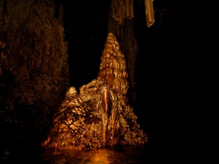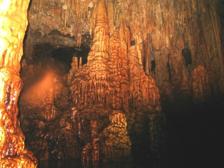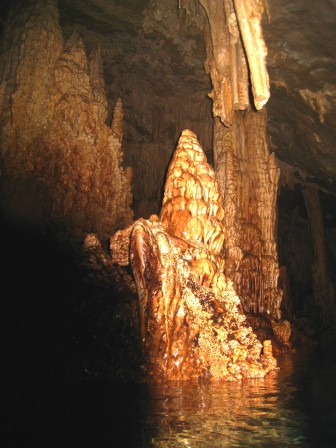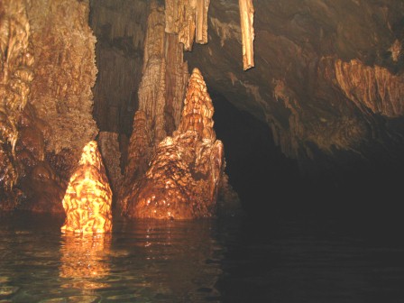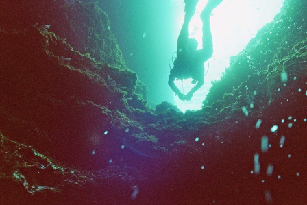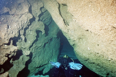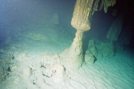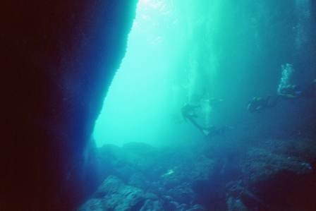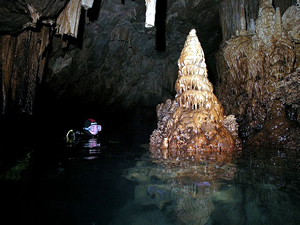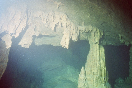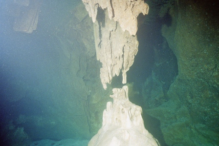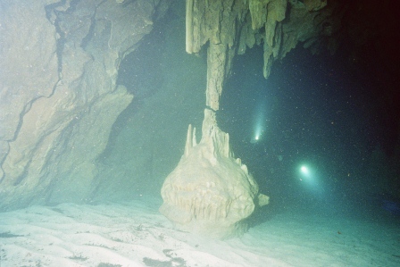 Die Höhle ist daher ungefährlich zu betauchen, da immer aufgetaucht werden kann und man sich in einem Luftgefüllten Dom befindet in dem zurückgeschwommen wird. Am Ende des Tauchgangs, gibt der Guide das Zeichen zum Auftauchen und man glaubt in einem Zuckerbäckerladen zu sein. Die Tropfsteine funkeln in den Lampen in allen Farben um die Wette. Hier zeigt sich der Vorteil der kleinen Digitalkameras, die über und unter Wasser scharfe Bilder liefern können. Ich dagegen mit meiner Nikonos 5 bin Überwasser auf Fotos meiner Mittaucher angewiesen. Hier aus der Homepage der Basis.