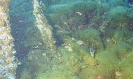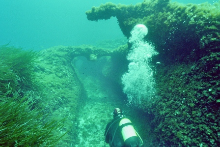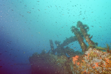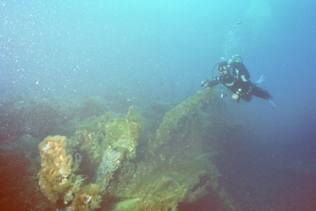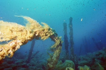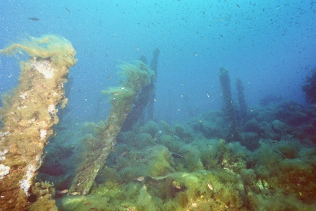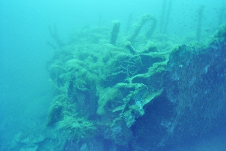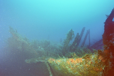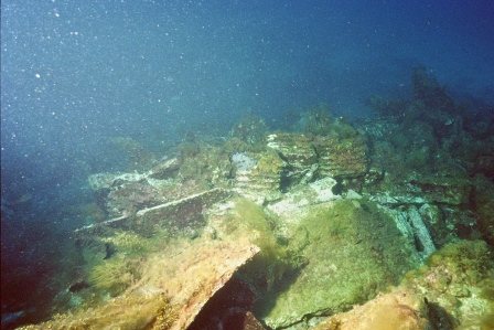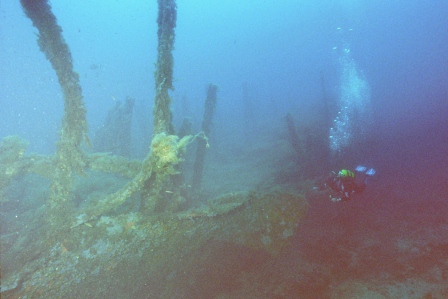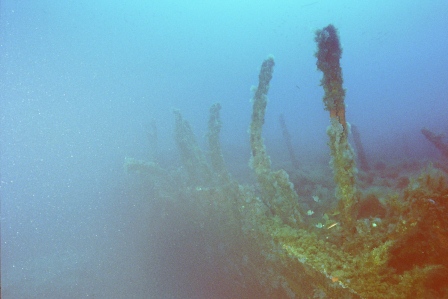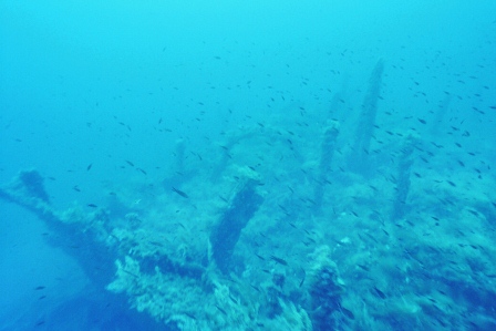 Wrack Malakoff Wie schon gesagt, die Fahrt dauert etwas länger, gepeilt wird mit allen Hilfsmitteln und der Anker fällt punktgenau neben das Wrack. Für diesen Ausflug werden die Taucher vorher für den Tauchgang getestet, da er ein gewisses Können voraussetzt. So ist der Abstieg am Ankerseil ein Abstieg ins Blaue, aus dem langsam das Wrack mit seinen Spanten sichtbar wird. Bei 30m schwebt man über den Planken, das Heck befindet sich auf 40m. Leider ist nur noch der aufgerissene Rumpf sichtbar, da das Schiff bei der Ladungsbergung gesprengt wurde.