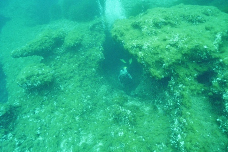 Zurück geht es durch einen großen Torbogen, der sich auch über Wasser fortsetzt. In der ruhigen Ankerbucht gibt es Barsche, Muränen, Kraken, Nacktschnecken, hunderte von Brassen und Stachelmakrelen und auf dem Sand liegen Rochen und Flughähne um sich fotografieren zu lassen.