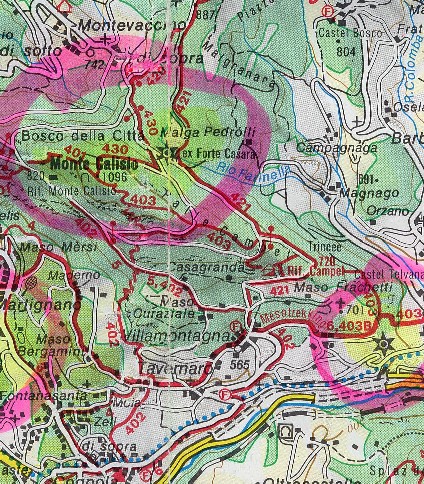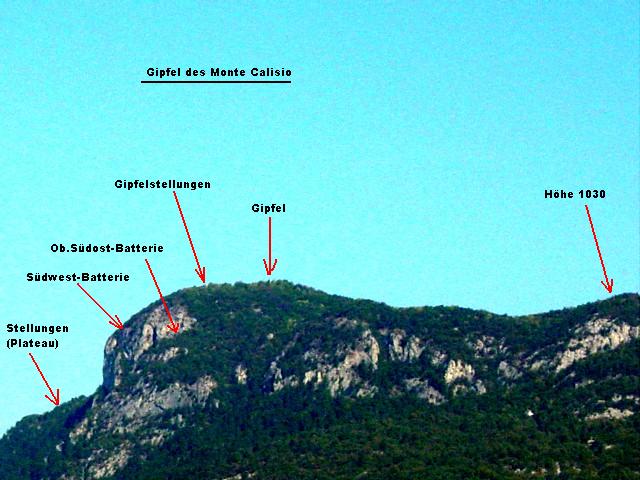 Süden in offenen Kavernen,ca.6-8 m tief in den Fels gehauen. Knapp unterhalb des Gipfels, ca. 50 m tiefer, sind enorme Tunnelanlagen in das Gestein gehauen. Diese Tunnel verbanden alle 5 Kanonenstellungen untereinander, sowohl horizontal als auch durch Kamine (senkrechte Steigeschächte für Munitionsaufzüge), und eine Galerie führte direkt von diesen Stellungen zu dem Gipfelbereich des Monte Calisio, auf dem die beiden Geschützbrunnen der Panzerhaubitzbatterie angelegt wurden. Die Größe der Öffnungen dieser 5 Kavernenstellungen lässt darauf schließen, das es sich um Geschütze gehandelt haben muss, die ein größeres Kaliber als das der 9cm/M75 zuließen. Die Öffnungen sind teilweise breiter als 2 Meter und haben eine Höhe von bis zu 3 Metern, gleiches gilt für die sich im Berge befindenden Tunnelanlagen, auch diese sind sehr breit und hoch. Innerhalb dieser Galerien befinden sich mit Beton verkleidete kleine und kurze Seitenkavernen, die der Lagerort der Bereitschaftsmunition der Geschütze waren und auch der Logistik/Unterkunft dienten. Die Schussrichtungen der Kavernenbatterien waren West bis Nordwest, und diese konnten damit das Etschtal wirkungsvoll bestreichen. Diese Stellungsbereiche mussten nicht zusätzlich durch Infanterieanlagen oder Drahthindernisse geschützt werden, der Berg fällt dort fast senkrecht ab, lediglich 100 bis 150 m unterhalb sind Infanteriestellungen auf dem weniger steilen Abhang zu erkennen. Oberhalb dieser Kavernenstellungen sind in Korrespondenz der Schussrichtung dieser Kanonen offene Stellungen im Gipfelbereich. Die Stellungen sind als Rondell mit einem jeweiligen Unterstand errichtet, entweder waren diese mit MG oder leichter Feldartillerie bestückt zur Vorfeldverteidigung unterhalb des Gipfelbereiches. Außer der Militärstrasse vom Werk Casara gab es einen wesentlich kürzeren Zugang zu diesen Stellungen, der allerdings nur von der Infanterie ohne schweres Gerät genutzt werden konnte und der unterhalb der südlichen Stellungen der Kanonen innerhalb der Vorfeldverteidigung endet. Am Beginn dieses Verteidigungsbereiches wird dieser Pfad durch eine Stellung mit Unterstand kontrolliert. Von diesem Bereich aus führt wiederum ein schmaler Infanterieweg zum Gipfel unterhalb und an den Kanonenstellungen vorbei. Auch diese schmale Zuwegung vom Gipfel wird durch MG-Stellungen kontrolliert. Eine Abzweigung dieses schmalen Pfades führt an den westlich gelegenen 5 Kanonenstellungen auf der Höhe ihrer Öffnungen zu einem schmalen Eingang im Felsmassiv ,der direkt mit den weitläufigen unterirdischen Tunnelanlagen verbunden ist. Der Weg ist nur ca. 30-50 cm breit, konnte im Falle einer feindlichen Bedrohung also sofort mit geringem Aufwande weggesprengt werden.