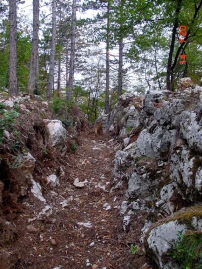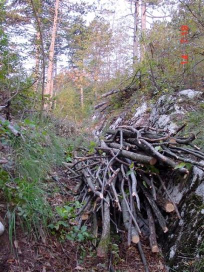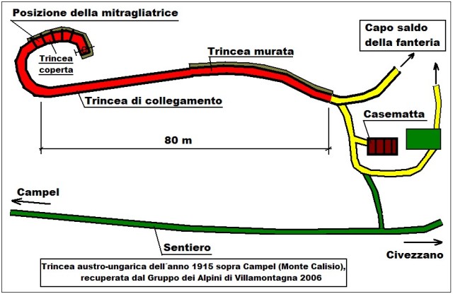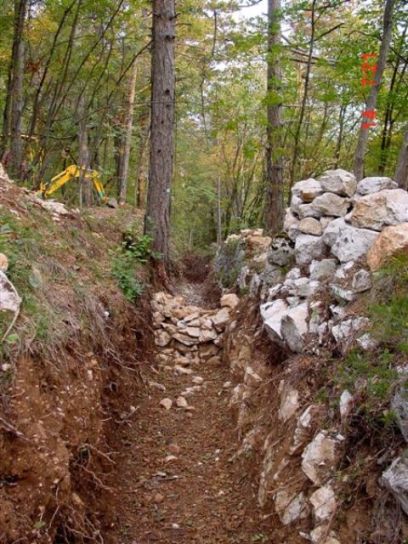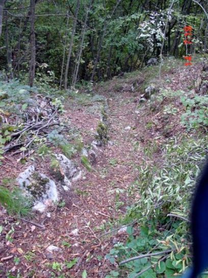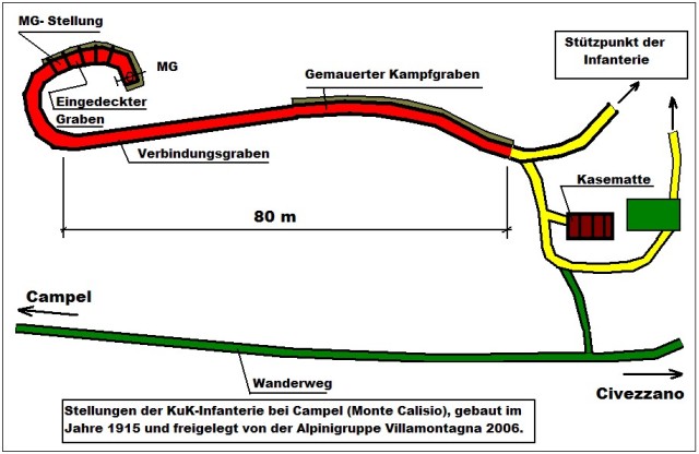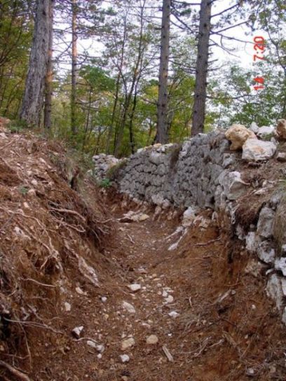 Heute wieder einmal ein großer Tag. Der letzte Teil des Grabens wurde freigelegt, die Bäume und das Unterholz geschnitten, der Minibagger der Forstverwaltung trifft ein, um die letzten 30m des Hauptgrabens freizulegen, danach fehlt nur noch die halbmondförmige Flankenstellung mit ihrem gemauerten Grabenteil (mit Dacheindeckung) und die MG-Stellung. Insgesamt werden 80 m Hauptkampfgraben , der Verbindungsgraben zur MG Stellung, der Verbindungsgraben zum unteren großen Infanteriestützpunkt und eine Kasematte freigelegt und instand gesetzt. Wir sind an einem guten Punkt, alles ist freiwilliger Arbeitseinsatz der Alpini und mit meiner Wenigkeit. Das schwere Gerät bekommen wir von der Forstverwaltung gratis gestellt. Heute war auch der Aufmasstag, das Gelände ist soweit freigelegt, das ich endlich messen konnte. Während der Ausgrabungen stossen wir in einem kurzen Teilstück, das in den Felsen gehauen wurde, auf die Originalbreite und Tiefe des Grabens, es ist sehr schön erhalten, der Boden ist sauber planierter Kalkfelsen, die Seitenwände sind senkrecht und genau abgestemmt. Vorab: Die Breite war exakt 1,40m, die Tiefe war im Mittel 1,80m des Kampfgrabens, lediglich der Verbindungsgraben zur MG Stellung war flacher. Feindseitig bestand eine Brüstung mit Gewehrscharten, entweder aus Holzstämmen oder aus Felsen gemauert. Folgende Arbeiten sind geplant: Es wird nichts "kaputt" restauriert. Der Graben wird nur in Originalbreite und Tiefe freigelegt. Die Brüstungen werden wir nicht bauen, da wir nicht genau wissen, wie diese aussahen. Die Naturstein- Trockenmauern werden repariert. Auch die Flankenstellung mit MG wird nur freigelegt. Das Dach werden wir nicht bauen. Die Kasematte wird ausgegraben. Sie ist eine klassische Munitionskasematte und davon habe ich genug Ausrüstungsbehelfe und Zeichnungen der Geniedirektion. Das Projekt: Sie bekommt 3-4 IPE Stahlträger, darüber ein Wellblech als Dach. Dann müssen wir entscheiden: Stampfbeton 20cm dick plus Erdbedeckung oder nur eine dicke Erdaufschüttung. Okt. 2006 Gruss VJ