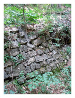 Werkstraße, rechts der abgestützte Berg, links die Trockenmauer als