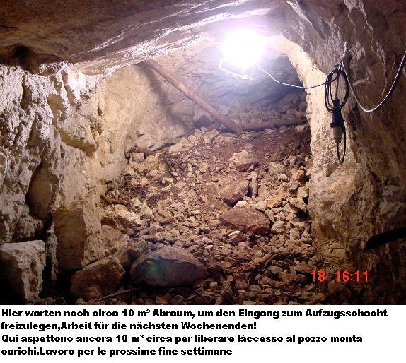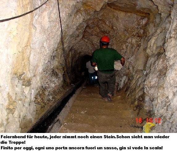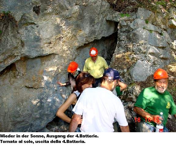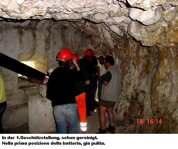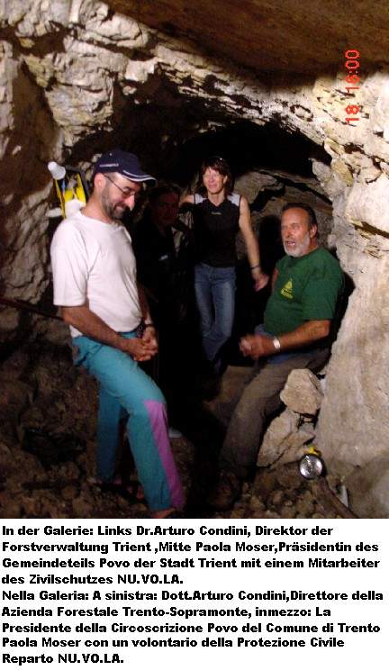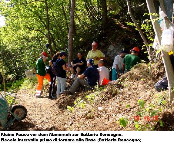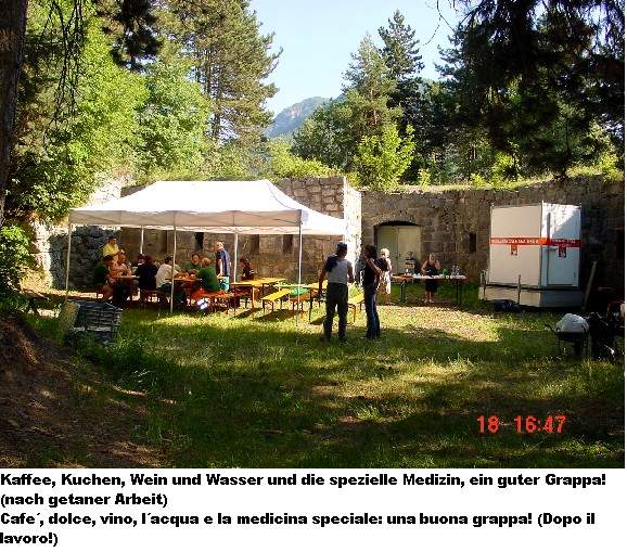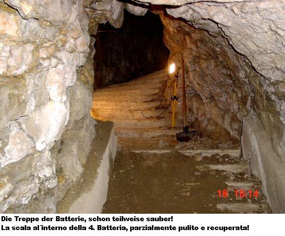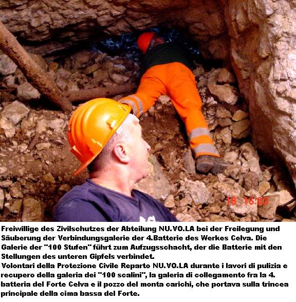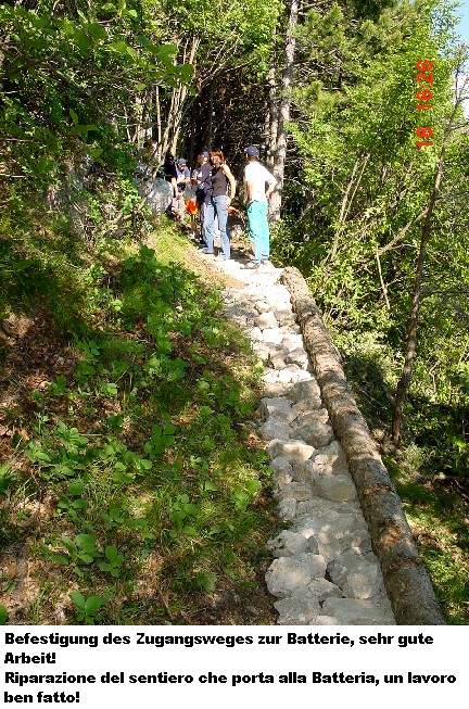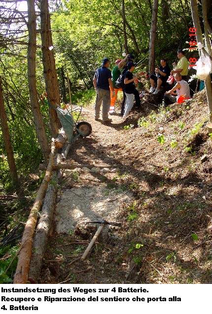 freiwilligen Helfern. Und am Samstag, den 18.06.2005, war es soweit. Der Zivilschutz und die Alpini rückten mit Schaufeln, Schubkarren, Stromgeneratoren und sonstigen Werkzeugen an. Eine schlagkräftige Truppe, die sich ein hohes Ziel setzte: die 4.Batterie mit ihrer Verbindungsgalerie der „100 Stufen“ zu säubern und zu sichern und die Wege zur Batterie zu erneuern. Dies ist eine große unterirdische Anlage und es wird noch so manches Wochenende brauchen diese wieder begehbar zu machen. Logistisch wird der Zivilschutz von der Forstverwaltung der Gemeinde Trient unterstützt.