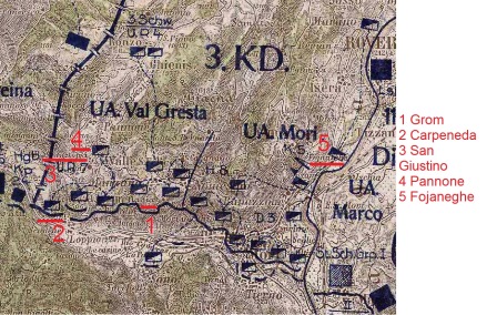 Buona Sera, Monte Grom- molta roba e chiarito alcune cose non vere nelle descrizioni delle posizione, per esempio una posizione "obice" e´una posizione per un generatore di corrente (!), Biaena est e Castel Frassem- posizioni di batterie durante la preparazione dell´offensiva di primavera 1916,Lenzima- purtroppo poca roba Monte Grom, viele Bilder und auch einige Unwahrheiten in den Beschreibungen der Positionen geklärt, eine Haubitzenposition ist in Wahrheit ein Generatorstand für einen Scheinwerfer(!), Biaena Ost und Kastell Frassem- Batteriepositionen für die Vorbereitung der Frühjahrsoffensive 1916 und Lenzima- Für den Grom brauche ich noch Zeit die ganzen Fotos zu ordnen und muss auch die Dokumente vorher betrachten, jedenfalls war in der Kavernenbatterie eine 10,4 cm autotransportiert eingestellt. Als Vorschuss Karte vom Monte Grom aus dem Jahre 1915, die aber nicht die Situation der nachfolgenden Kriegsjahre dokumentiert, da wurde danach ungeheuer gewühlt.