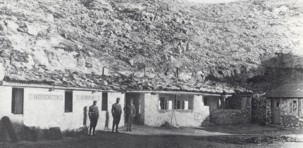 Historisches Foto der Kommandokasernen mit drei Soldaten