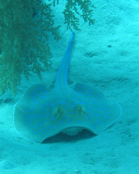 Der Blaupunktrochen an seinem Lieblingsplatz, einer einsamen Koralle auf