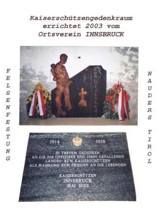 In der Felsenfestung NAUDERS am RESCHENPASS wurde ein zentraler Gedenkraum für alle Gefallenen Landesschützen u. Kaiserschützenschützen 1.Weltkrieges 1914-1918 Errichtet und Geweiht.