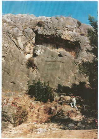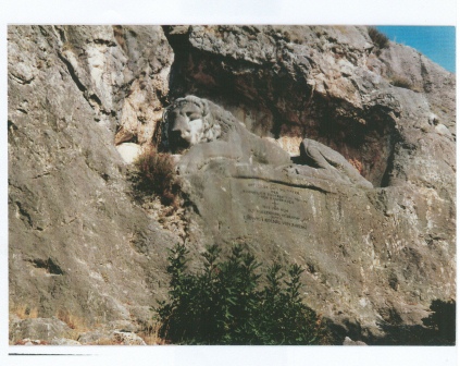 Königlich-Bayerisches Kriegerdenkmal in NAUPLIA (griech. Nafplion), Griechenland – Peloponnes Das Monument liegt auf der Peloponnes-Halbinsel, zu erreichen von ATHEN – KORINTH ARGOS – NAUPLIA. Der Militärkirchhof liegt vor Nauplia´s Vorort PRONIA an der Straße nach EPIDAURUS. Zeitgenössischer Bericht der ehem. „Leipziger Illustrirten Zeitung“: Monument der in Griechenland 1833 – 1834 gebliebenen Bayern Nachdem der von dem Bildhauer Christian Siegel aus Hamburg vorgelegte Entwurf zu einem für die in Griechenland Gebliebenen des bayerischen Hilfskorps bestimmten Monument die Genehmigung des Königs Ludwig von Bayern erhalten hatte, wurde diesem Künstler auch der ehrenvolle Auftrag der Ausführung übertragen. Am Weihnachtsabend 1838 auf griechischen Boden angelangt, schritt er alsbald ans Werk. – Der vor Nauplia´s Vorstadt Pronia an der Straße nach Epidaurus gelegene Militär-Kirchhof ist von hohen, gewaltigen Massen weißgrauen Flözkalks begrenzt. Aus diesem mußten 38.000 Kubikfuß Gestein herausgearbeitet werden, bevor -1839- sich zum Kunstwerke –ein schlafender Löwe- brauchbares Material fand. Die Zerstörung des Modells und eines Teiles der Arbeit durch Sprengungsversuche von Seiten übelgesinnter Griechen war unter den vielfach zu bekämpfenden Schwierigkeiten die größte und empfindlichste. Doch Siegels ausdauernder Mut hielt aus und schon am 15. November 1841 wurde das vollendete Werk feierlich enthüllt. Die gelieferte Ansicht ist nach der eigenhändigen, auf einen Winkel von 25 Grad berechneten Zeichnung des Künstlers wiedergegeben. Des Löwen Länge beträgt 31 Fuß. 38 Fuß über dem Begräbnisplatz ruht sein gewaltiges Haupt. Hatte schon der Entwurf Beifall gefunden, so konnte nicht fehlen, daß auch das ausgeführte Werk allen Anforderungen der Kunstsachverständigen vollkommen entsprechend sich darstellte. Über der Saat von Menschengebeinen ruht das kollossale Tier; unter ihm deutet folgende Inschrift seine Bestimmung an: D I E O F F I Z I E R E U N D S O L D A T E N D E R K O E N I G L I C H B A I E R I S C H E N B R I G A D E I H R E N C A M E R A D E N + 1833 & 1834 Z U R V O L L E N D U N G G E B R A C H T VON L U D W I G I. K O E N I G V O N B A I E R N