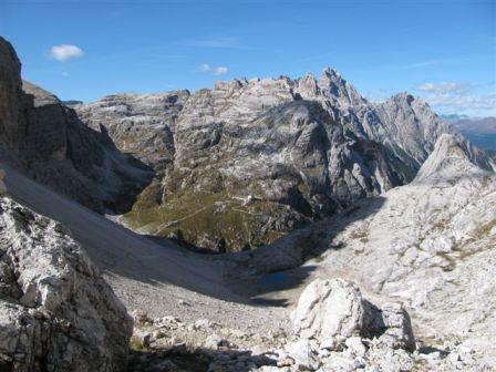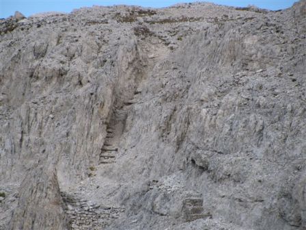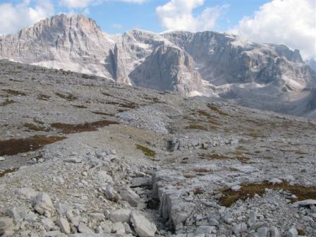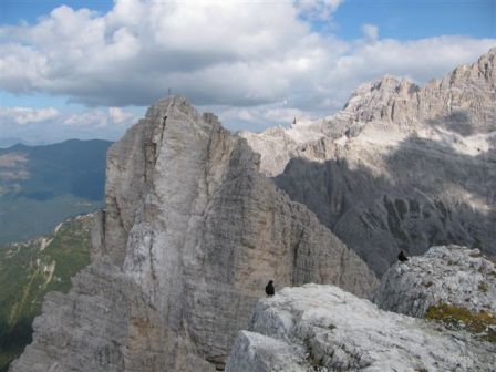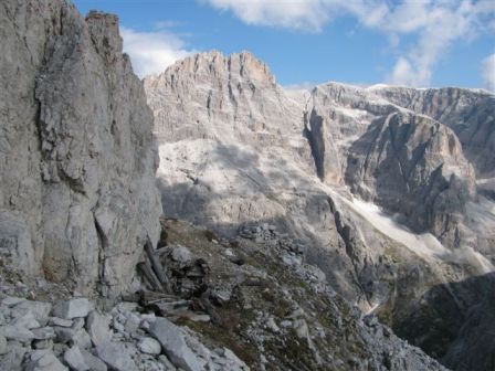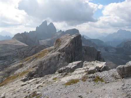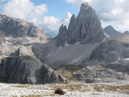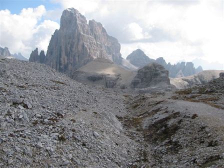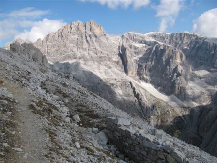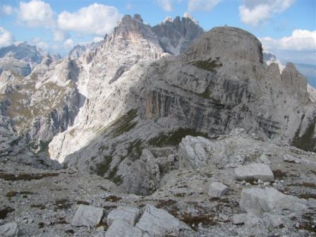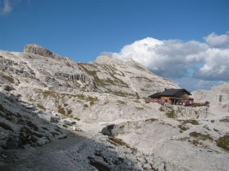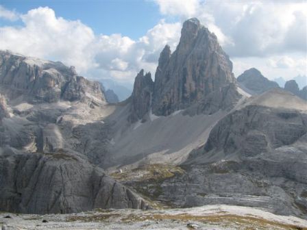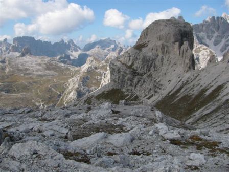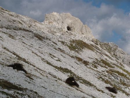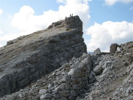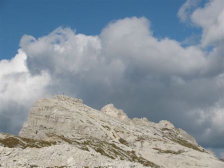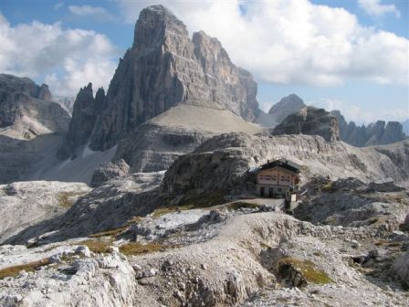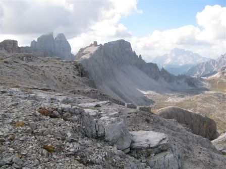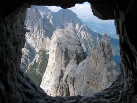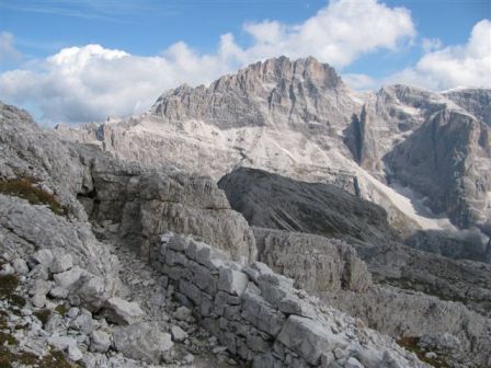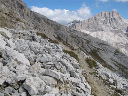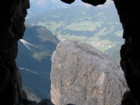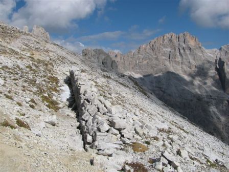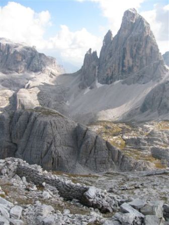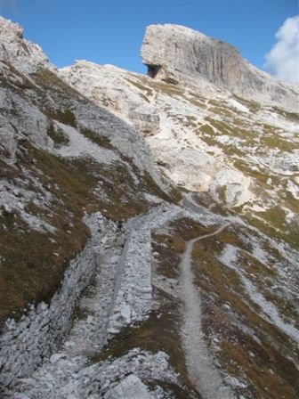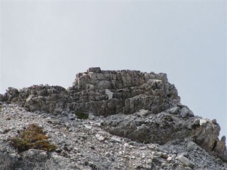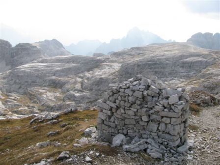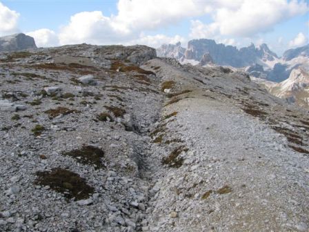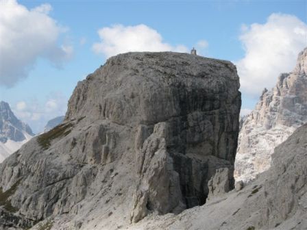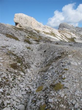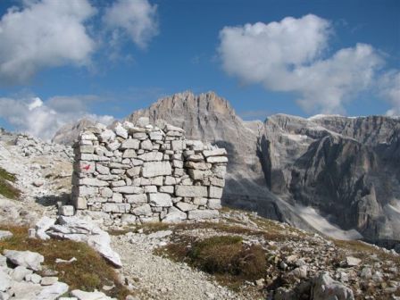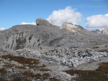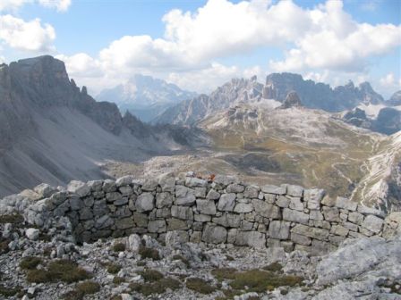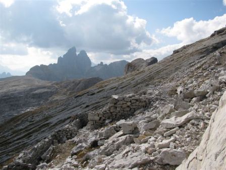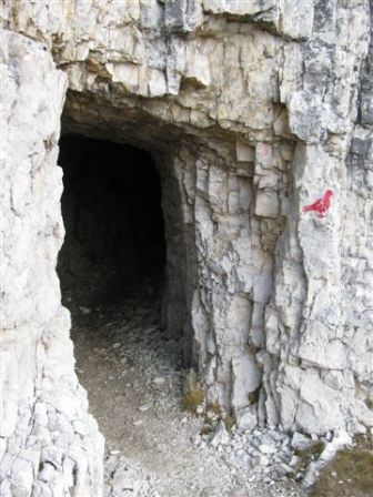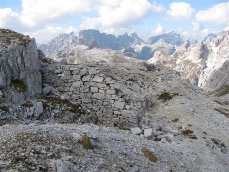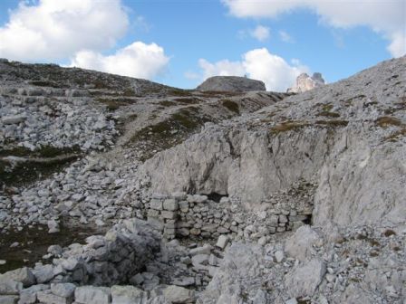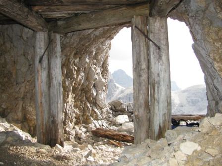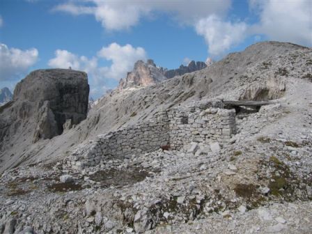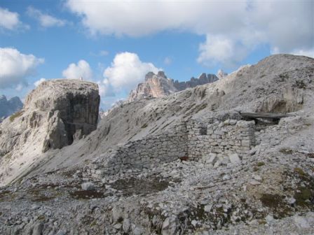 Rundtour Oberbachernspitze Tourempfehlung: Parkplatz Auronzohütte 2.320m - Lavaredohütte 2.344m (Weg 101) - Büllelejochhütte 2.528m (Weg 104/107) - Oberbachernspitze 2.675m - Büllelejochhütte 2.528m - Drei Zinnen Hütte 2.405m (Weg 101) - Paternsattel 2.454 - Lavaredohütte 2.344m - Auronzohütte 2.320m. Landschaftlich einmalige Rundtour, die allerdings eine gewisse Kondition benötigt. Mit Besichtigung der Stellungen an der Oberbachernspitze sollte eine Gesamtgehzeit von mindstens 7-8 Stunden eingeplant werden. Da die Hütten und Stellungen bereits auf deinen Seiten beschrieben sind, soll hier nur auf den Tourenteil Büllelejochhütte - Oberbachernspitze eingegangen werden. Bereits hinter der Büllelejochhütte beginnen die Laufgräben, die sich den Hang bis zu einem großen italienischen Barackenlager hinaufziehen. Von hier oben aus sehr schöner Rundblick auf die Drei Zinnen, Toblinger Knoten, Oberbachernspitze und die Sextener Sonnenuhr. Auf der westlichen Oberbachernspitze ist ein Denkmal erkennbar. Dieser Berg bleibt jedoch erfahrenen Bergsteigern vorbehalten. Erkennbar sind neben Laufgräben, Gebäude- und Konservenresten auch noch die Treppen. Von einer Begehung wird jedoch abgeraten. Von hier aus leicht steigend durch einen begehbaren Tunnel und einigen gähnenden Abgründen links zur Oberbachernspitze (2.675m) mit traumhaftem Rundblick. Bitte Vorsicht, hinter dem Gipfelkreuz geht es mehrere hundert Meter senkrecht nach unten. Um den ganzen Bergrücken zu zeigen, wurde der Blick vom Giralbajoch auf die Oberbachernspitze mit eingestellt. Unter dem Gipfel befindet sich die Gipfelkaverne - sehenswert mit Fenster. Von hier aus nach kurzem Abstieg zur italienischen Feldwache mit Gebäuderesten und ebenfalls einer Kaverne mit Blick auf den dahinter liegenden Einser (Cima Una). Teilweise sieht man durch das Fenster die Zugänge zu den italienischen Stellungen. Die Stützbalken in der Kaverne wurden offenbar erneuert. Diese Tour kann nur in der schneefreien Zeit Juli bis September bei gutem Wetter durchgeführt werden. Als Einkehr wird die Büllelejochhütte empfohlen. Öffungszeiten Mitte Juni bis Anfang Oktober. Viele Grüße nach München. KH