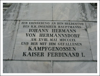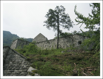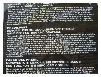 Sport-Optiker Am 10 April 1809 wurde der Feldzug gegen Napoleon von den Österreichern eröffnet. Hauptmann Hermann von Hermannsdorf verteidigte das unter dem Pass-Sattel gelegene Werk gegen due anstürmenden Franzosen. Schon am 18 Mai konnten die Verteidiger dem Ansturm der zahlenmäßig überlegenen Gegner nicht mehr standhalten. Hauptmann Hermann starb mit dem Degen in der Faust. Alle seine Leute erlitten das gleiche Schicksal. Die Franzosen sprengten das Werk. Wegen der beispiellosen, heldenhaften und aufopfernden Verteidigung des Pass-Sattels weihte die Monarchie 1847 das Hermannsdekmal ein. Österreich beschloss 1848 durch den Ausbruch der Revolution in Italien, an den alten Stellen neue Sperranlagen zu bauen. Die als Pass-Sperre Predil 1848-50 errichtete Anlage bestand aus dem nördlich der Straße liegenden Kreuzblockhaus und der südlich der Straße gelegenen Straßenbatterie die durch eine Poterne miteinander verbunden waren. Bereits 1878 kam man zur der Ansicht das die Pass-Sperre zur Verteidigung ungeeignet sei darum baute man im Tal die Flitscher Klause. Die Passsperre wurde 1898 aus dem fortificatorischen Objekten ausgeschieden und erhielt 1899 den -Namen Depot Oberbreth der 1907 auf Depot Predil geändert wurde bis zum Ende des 1.WK war sie Unterkunft und Brieftaubenstation. Sie wurde nie beschossen und verfiel zur Ruine.