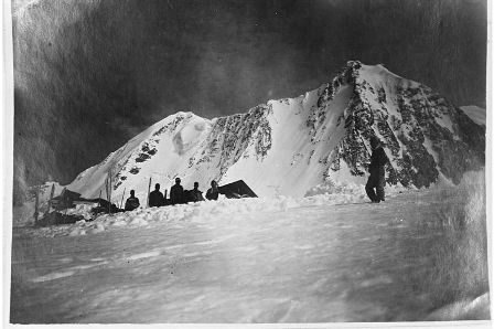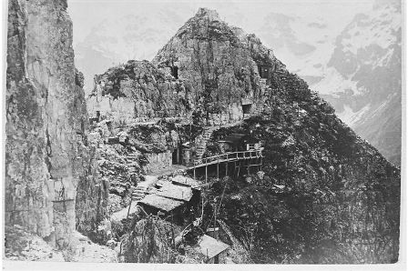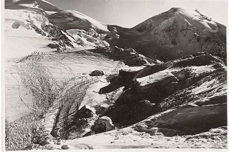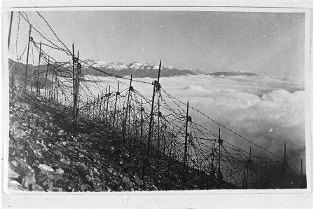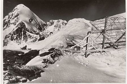 Das Bild scheint die gleiche Aufnahmestelle zu sein nur in die andere Richtung nach Süden. Im Vordergrund der Drahtverhau am Cevedalepass, dahinter rechts der Monte Rosole, links der Gletscherhang vom Cevedale.