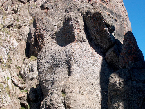 Teleblick in die Felsenstellung, die Unterstände kleben wie Adlerhorste im Fels