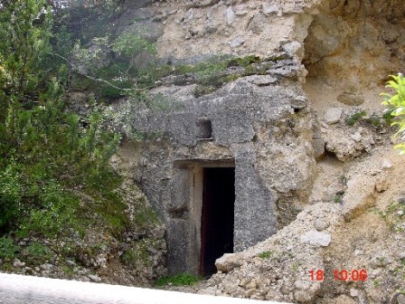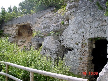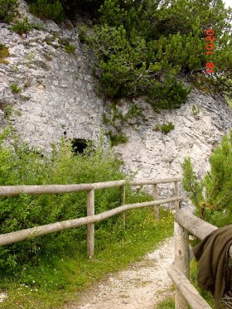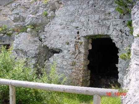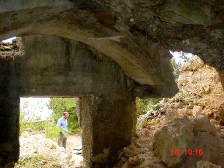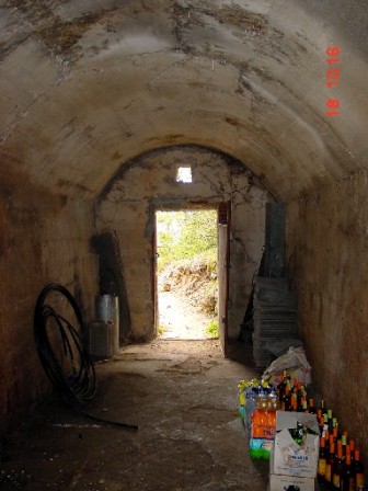 Wieder zurück auf dem Armierungsweg liegt gleich hinter der Kurve der 2.Kavernenkomplex, der 1910-11 bereits angelegt wurde. Hierbei handelt es sich um 3 Kavernen, die alle ausbetoniert wurden. Die mittlere kleine Kaverne diente als Ambulatorium. Erst im letzten Jahr stürzte die Front der 3 Kavernen ein, ohne aber diese selbst zu beschädigen. Die Betonhemdem hielten dem Erdrutsch stand. Eine Kaverne wird heute als Lagerkaverne von den Alpini genutzt, die 50m weiter unten die Schutzhütte gebaut haben und diese bis heute betreiben. Aus der kleinen Kaverne gelang mir das Foto, das meinen Freund Arturo zeigt, der gerade die wieder in Betrieb genommene 3-Kammer Zisterne in Augenschein nimmt. Diese ist voll funktionsfähig; sie wurde lediglich gereinigt.