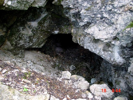 Weiter geht es auf dem Armierungsweg zur 3.Kaverne, auch diese 1915 hinzugebaut. Lediglich der Eingang zu ihr ist halb verschüttet, die Kaverne selbst aber intakt. Einige Meter weiter teilt sich der Armierungsweg auf. Die Strasse nach rechts abzweigend, führt zu Infanteriestellungen und zu unserer großen Überraschung: Auf eine ehemalige Baustelle! Dort wurde ein Geschützbrunnen mit unterirdischem Zugang gegraben, das abgebaute Gestein liegt dort noch. Der Brunnen selbst wurde vollständig beendet, aber nicht mehr ausbetoniert.