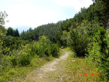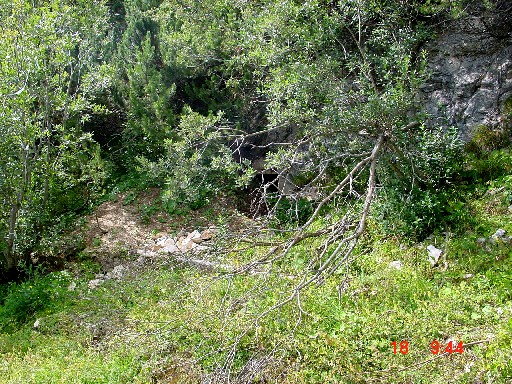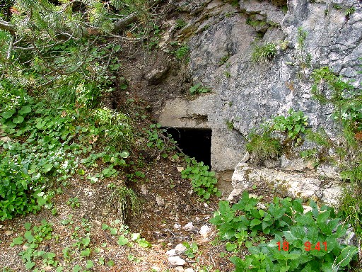 Weiter geht es auf dem Armierungsweg und bald stehen wir vor den halb verschütteten Kavernen, die bereits im Jahre 1910-11 gebaut wurden. Hierbei handelt es sich um 2 Kavernen, die mit einer betonierten Terrasse verbunden waren. Die Terrasse hatte ein Vordach. Die Andichtungen des Daches an der Front der Kavernen sind noch zu erkennen. Diese Kavernen incl. der Terrasse sollen jetzt freigelegt werden. Dort kommt auch eine Hinweistafel hin, die den Zweck dieser Unterkünfte erklären wird.