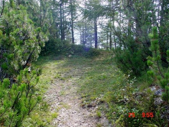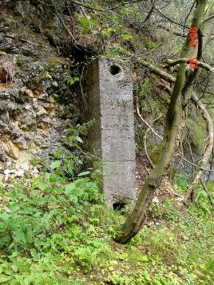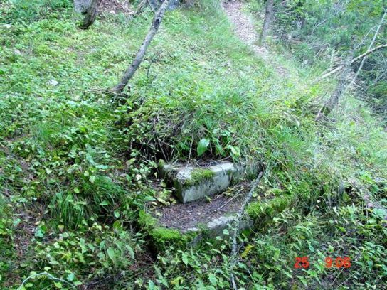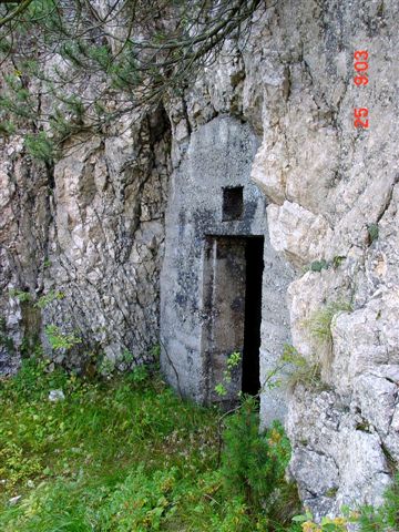 Die 2.Begehung des Stützpunktes Pale`: Gleich unterhalb der Baita der Alpini befindet sich eine erhaltene Haubitzstellung einer 10cm/M99. Dem Armierungsweg folgend finden sich weitere Kavernen aus den 2 Konstruktionsabschnitten des Stützpunktes. Diese Kavernen dienten als Unterkünfte und als Küche für die Batteriebesatzungen. Viele Details zeigen bis heute noch die innere Ausstattung der Kavernen, wie auch die Fundamente von Herden und den Vordächern. Selbst ein Schornstein ist erhalten geblieben. VJ