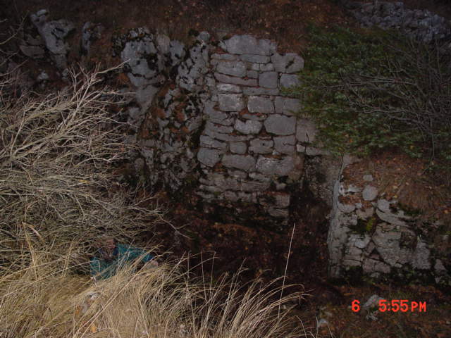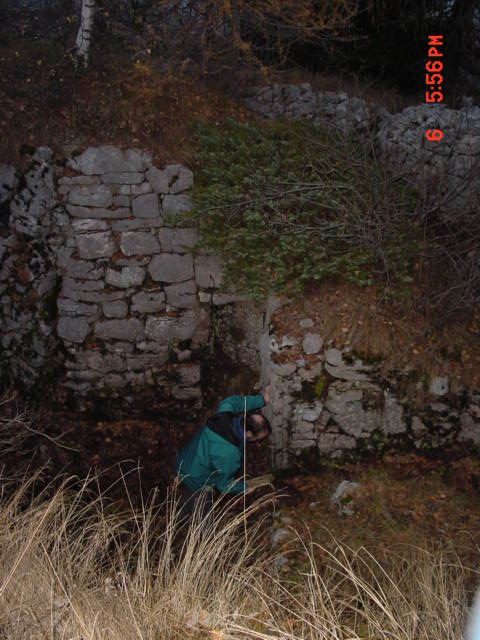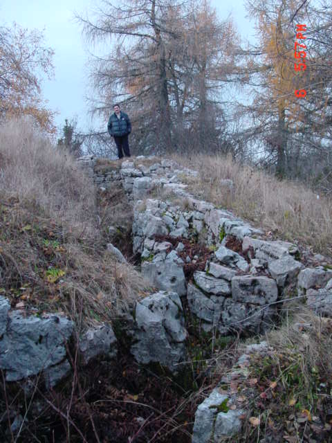 Ulrich Mößlang der Tauchbrillenspezialist Uli Mößlang / Volker Jeschkeit Der Stützpunkt: Er besteht aus einem umlaufenden Schützengraben mit vielen kleinen Nischen auf der rückwärtigen Seite. Gebaut wie eine Insel hat er in der Mitte einen tief angelegten Unterstand, der aus 2 Räumen bestand. Von dem Stützpunkt führen Stichgräben in das Vorfeld, die dort in einem weiteren durchgehenden Kampfgraben auf dem Grat des Bondone enden. Arturo untersucht den Unterstand, Franco beobachtet interessiert unser Treiben und lässt sich erklären, was das alles einmal war. Wir müssen jetzt schnell weiter. Es wird dunkel und wir haben diesmal keine Handscheinwerfer mit.