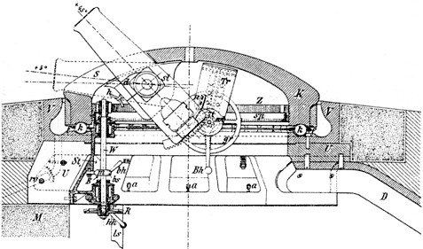 Schnitt durch die 8cm/M94P Panzerkuppel. Sie benötigte nur eine Kasematte zur Montage und hatte einen Stahltreppenaufgang. Bei der 2.Stellung auf dem Monte Celva legte man eine Zwischendecke ein unterhalb der Kasematte, der Zugang erfolgte seitlich vom Kampfgraben oder unterirdisch von der unteren Kavernenbatterie.