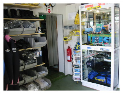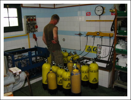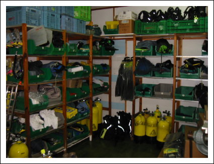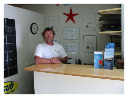 Die Tauchbasis wird von Dieter Payonk geleitet, der mit Hilfe eines zweiten Tauchlehrers für den reibungslosen Ablauf der Basis sorgt. Die kleine Tauchbasis ist unterhalb des Hotels gelegen und leicht über eine Treppe zu erreichen. Da sie nur begrenzte Stauflächen bietet, werden alle Ausrüstungsgegenstände mit einer Nummer versehen und bei Bedarf mittels einer Durchreiche auf die Terrasse der Tauchbasis gebracht. Eine kleine Box sowie eine Tragetasche werden den Gästen für ihr Equipment zu Verfügung gestellt. Anzüge und Jackets werden selbstverständlich aufgehängt. Die Leihausrüstung, bestehend aus 50 Anzügen, 20 Jackets und 10 jährlich erneuerten Automaten, sind in einem hervorragenden Zustand. 34 Stück 12 und 15 Liter Stahl Flaschen werden von zwei Kompressoren gefüllt. Ein kleiner Shop befindet sich ebenfalls in der Tauchbasis. Die große Terrasse bietet Aufhängemöglichkeiten, Süßwasserbecken zum Auswaschen der Ausrütung, sowie Sitzmöglichkeiten zum gemütlichen Beisammensein vor und nach dem Tauchen. Weiterhin spendet eine Markise angenehmen Schatten. Der Boden ist mit Kunststoffmatten ausgelegt. Die um 9.00 und 14.00 Uhr startenden Ausfahrten, mit dem 8 Meter langen Kutter, führen zu 50 möglichen Tauchzielen, welche 5-60 Minuten entfernt sind. Der Kutter liegt in der kleinen Bucht vor Anker und wird zum Einsteigen in seichteres Wasser gebracht. Das Einsteigen erfolgt in voller Montur, über einen der beiden Strände watet man zum Boot und steigt über eine Leiter ein. An Bord befindet sich eine Kühlbox für mitgebrachte Getränke, die in der Tauchschule zu erwerben sind. Sauerstoff befindet sich an Bord. Ein zweites, kleineres Boot steht ebenfalls zur Verfügung. Nachttauchgänge sind auf Anfrage in der eigenen Bucht möglich. Tauchkurse werden selbstverständlich, für Anfänger bis zum Tauchlehrer, nach CMAS und PADI angeboten.