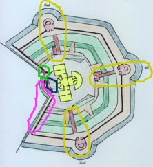 Gelbe Kreise: Poternen mit Kontereskarpenkoffer Das ein leuchtgelb eingezeichnete Gebäudeteil ist total abgetragen.