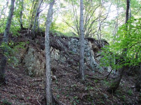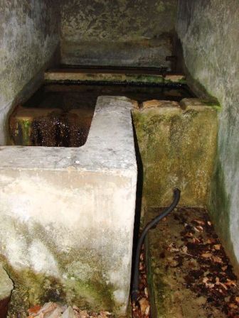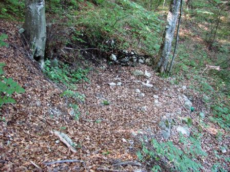 Die gefasste Quelle diente der Wasserversorgung des Monte Celva. Von dort ging die Wasserleitung über den Cimirlopass ab. Die zweite Quelle ist zerstört, sie diente der örtlichen Wasserversorgung. Die Quelle gibt auch Wasser im Hochsommer, jetzt hier im August haben wir zur Zeit eine enorme Trockenheit und fast 35 Grad in Trient. Oberhalb der Quellen sind die Verteidigungslinien und man sieht schon die Ecke einer weiteren großen Betonkasematte.VJ