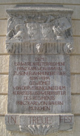 Das Königlich Bayerische 1. Schwere Reiter-Regiment „Prinz Karl von Bayern“ wurde am 16. Juli 1814 in der Pfalz als Regiment Garde du Corps gegründet. Bayern hatte bis dahin nur leichte Kavallerie-Regimenter. Der bayerische König Max I. Josef von Bayern (damals auch Kriegsminister) befahl die Aufstellung von schweren Kavallerie-Regimentern. Das Stammregiment war das 1813 gegründete Nationale 7. Chevauleger-Regiment "Prinz Carl von Bayern". 1825 wurde diese berittene Gardetruppe durch die Sparmaßnahmen König Ludwigs I. von Bayern in das Königlich Bayerische 1. Kürassier-Regiment "Prinz Karl von Bayern" umgruppiert. Die Pauken mussten in das Zeughaus abgegeben werden. Die Uniformen wurden vereinfacht. 1876 wurden der Kürass und der Metallhelm abgegeben. Es war das Ende für dieses Regiments als Schlachten-Kavallerie. Es wurde auf eine Einheitskavallerie im 1871 gegründeten Deutschen Reich hingearbeitet. Dennoch blieb dem traditionsreichen Regiment im neuen Namen die Erinnerung an die alte Funktion. Es hieß jetzt Königlich Bayerisches 1. Schweres Reiter-Regiment "Prinz Karl von Bayern". Sein Inhaber Prinz Karl, der Bruder von König Ludwig I., war 1875 verstorben. König Ludwig II. von Bayern befahl jedoch, dass das Regiment für alle Zeiten diesen Namen tragen solle. Neuer Inhaber war der bayerische Prinz Leopold, der Bruder des späteren König Ludwig III. von Bayern. Nach der Gründung und Rückkehr aus den Befreiungskriegen gegen Napoleon zog das Garde du Corps in die Isarkaserne auf der Museumsinsel. Aus hygienischen Gründen wurde später am Ufer die Neue Isarkaserne gebaut, worin die Kürasseure einzogen. Auf der Museumsinsel verblieb ein Reitplatz. 1902 zogen die Schweren Reiter in die neu erbaute Prinz-Leopold-Kaserne am Oberwiesenfeld. Damit entfiel das tägliche Ritual des Paradierens durch die Stadt von der Isar an das Oberwiesenfeld, was die Münchner sehr bedauerten. Es war doch eine Attraktion, wenn 700 Reiter mit ihren Lanzen mit wehenden weißblauen Wimpeln und in blauer Uniform, unterstützt von einem Kavallerie-Musikkorps voran täglich durch die Stadt ritten und das Volk in ihrem grauen Alltag unterhielten. Im Juli 1914 feierte das Regiment sein