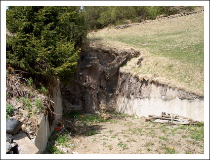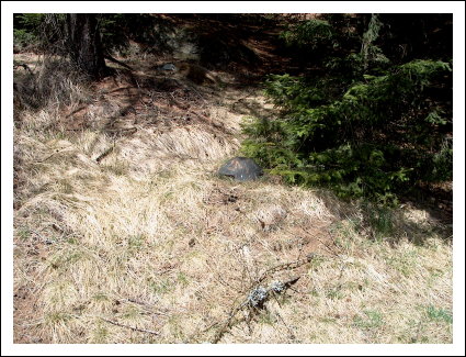 Scharten im Wald Überblick des Bunkerhügels. Vorne eine Scharte (mit geschlossenen Klappen) rechts daneben der Weg zum 2 Eingang, in der Wiese oberhalb meines Lieferwagens der Eingang in der Wiese. Auf dem großen Waldhügel drüber befindet sich die Anlage Plamort von der ich dir schon Bilder gesendet habe. Die Bergspitze ist die Klopaierspitze.