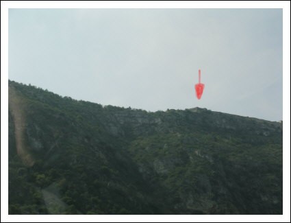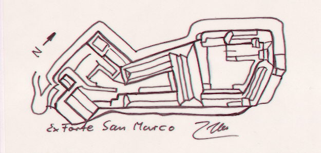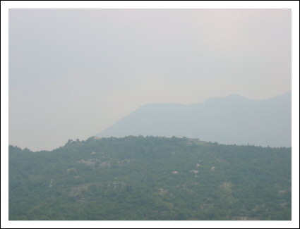 Oben auf dem Hügel erkennt man im Dunst die Reste des Ex Forte.